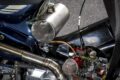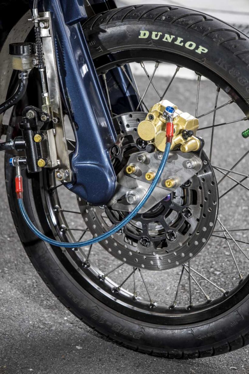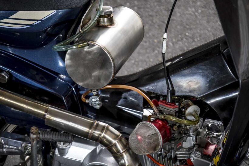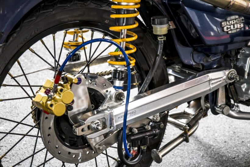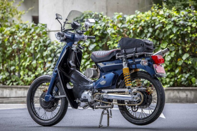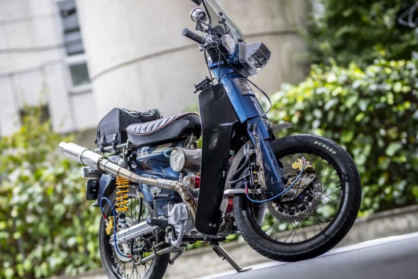 バイクカスタム ボトムリンクのままディスクブレーキ化が凄い!DIYで作り上げたスーパーカブ90の技ありカスタム【写真・3枚目】 フロントはφ260mmローターを採用。フォークボトムにマスターシリンダー&タンクを設け、純正ハンドルのままディスク化を実現している。 純正とほぼ同寸(345mm)の社外リヤショックを装着。リヤブレーキはφ245mmローター+ミニモト製2ポットキャリパーの組み合わせ。 ディスクブレーキ化に伴い、メーター&ケーブルは電気式に変更。タイヤ(ダンロップK888)の外径が大きいため、適正サイズのセンタースタンド&サイドスタンドを自作している。 自作アルミ燃料タンクは容量約2.5L。純正タンクと合わせて巡行距離を大幅に向上させている。自作ショートマニホで装着したキャブレターのファンネルには“茶こしフィルター”を追加。 この画像の記事を読む