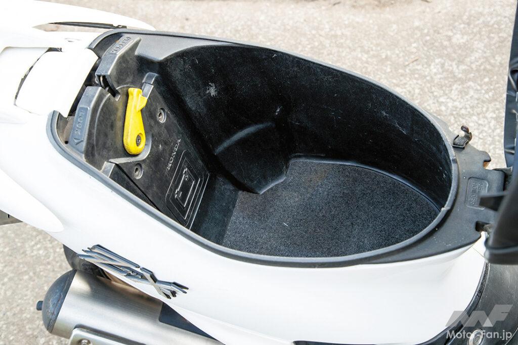 それまで原付スクーターといえば、買い物などで荷物を積むならば、自転車と同様に後付けのフロントバスケット(前カゴ)やリヤキャリアもしくは足元に置くのが常。1980年代中盤まではヘルメット着用義務がなく“ノーヘル”でもOKな時代の話だった。