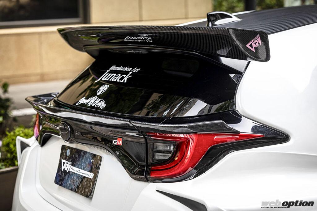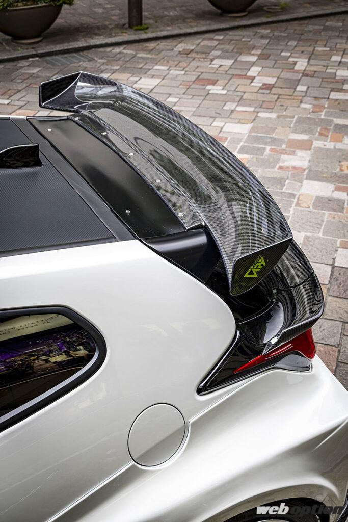 GTルーフウイングは、保安基準の範囲内で最大限のパフォーマンスを発揮できるように設計。GRヤリスのボディラインを崩さないようにデザインされており、グラマラスなスタイリングをより際立たせる効果も抜群だ。
