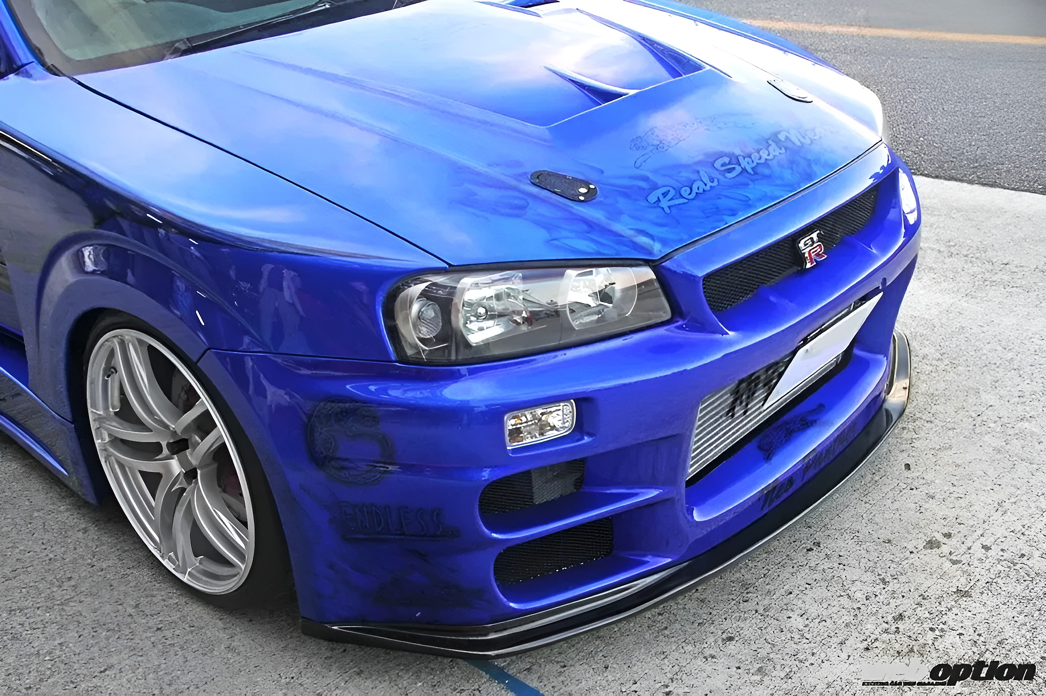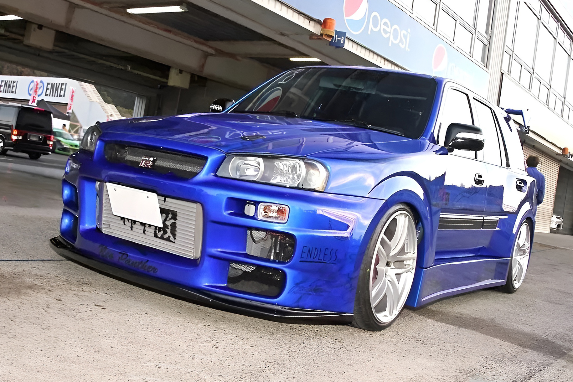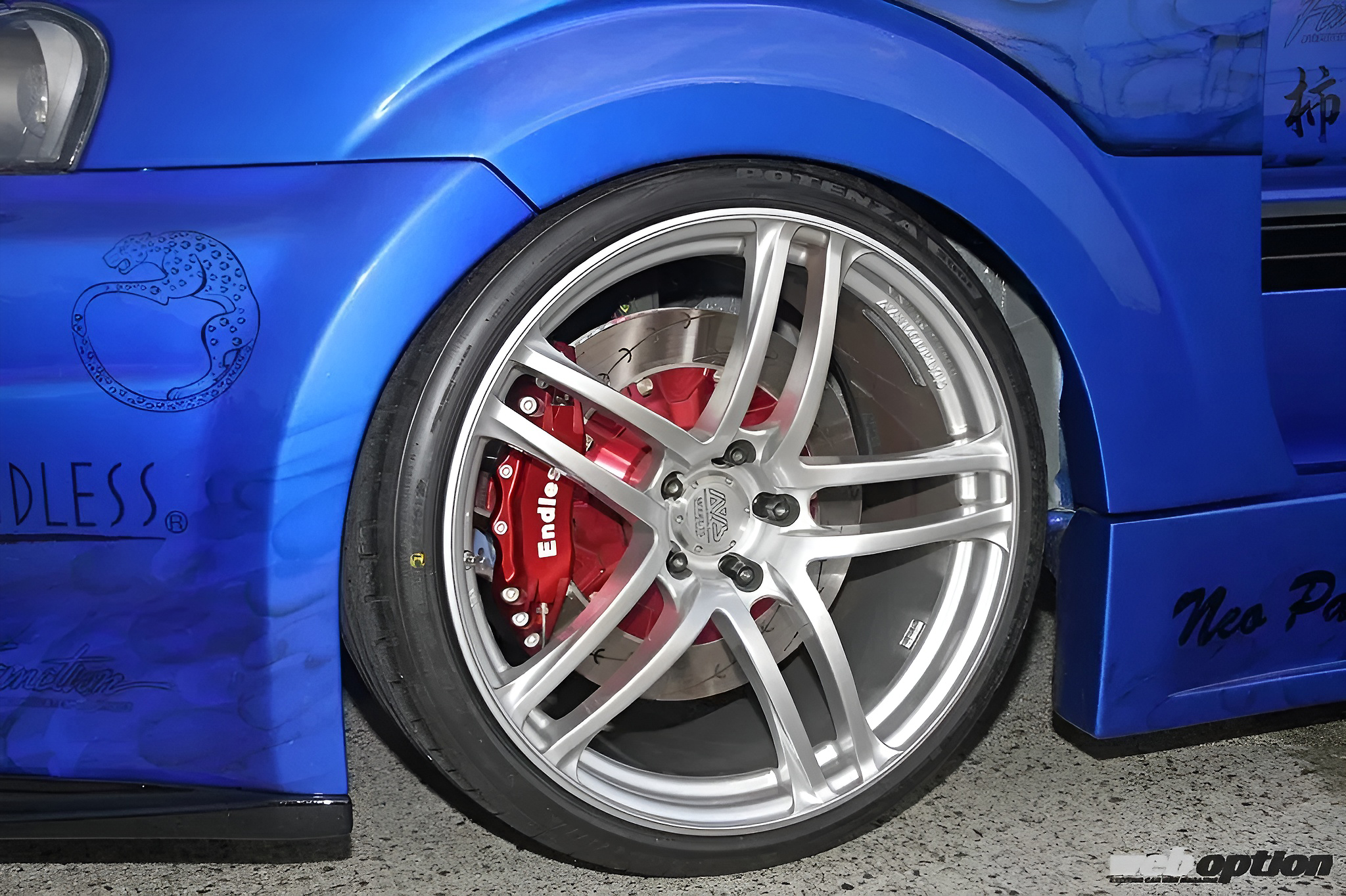 カラーリングはキャンディブルーをベースにエンドレスパンサーなどをミューラルペイント。カラーリングにあたっては、エンドレスの承諾もとった公認仕様(!?)だという。攻撃的なフロントバンパーはトップシークレット製だ。