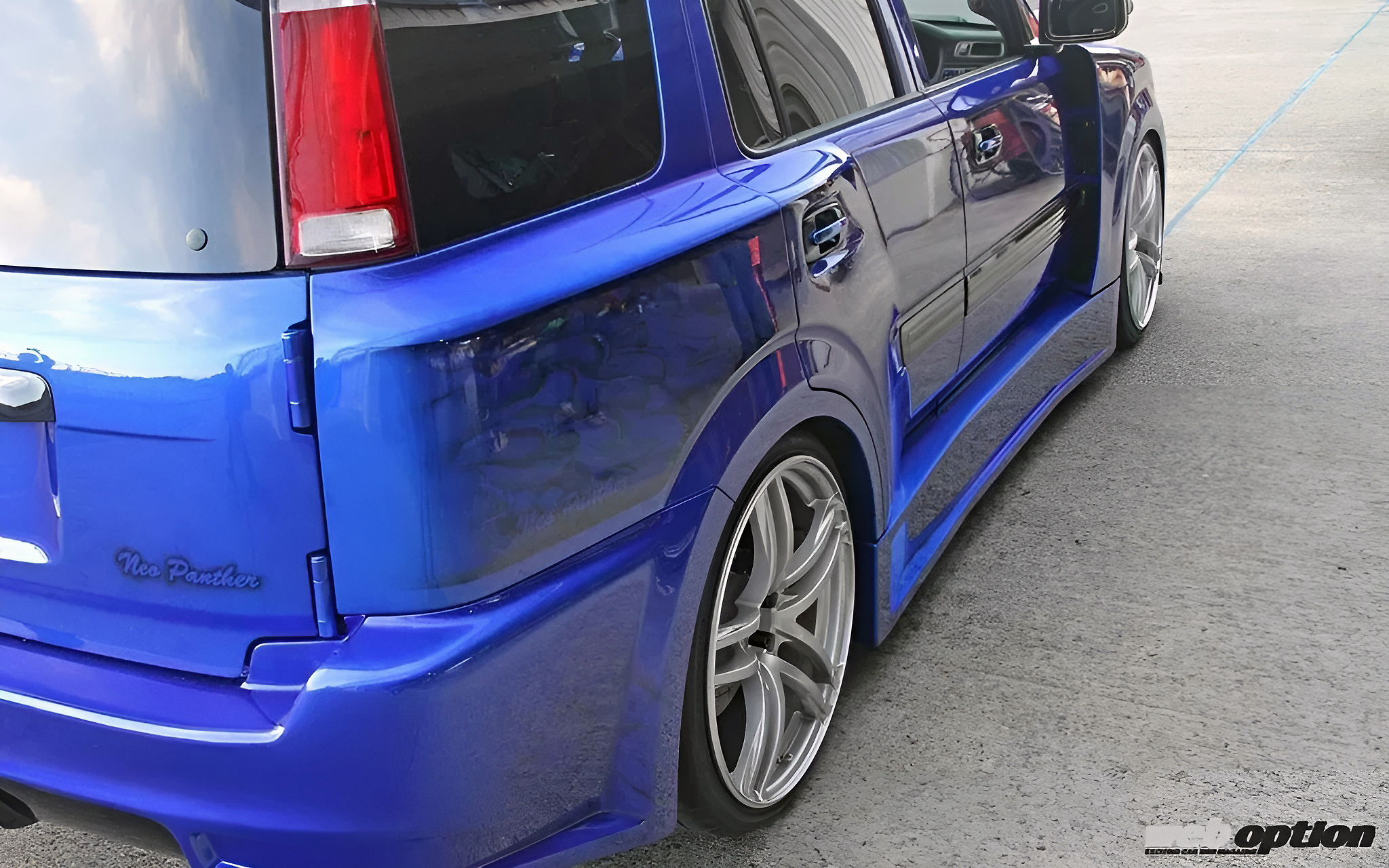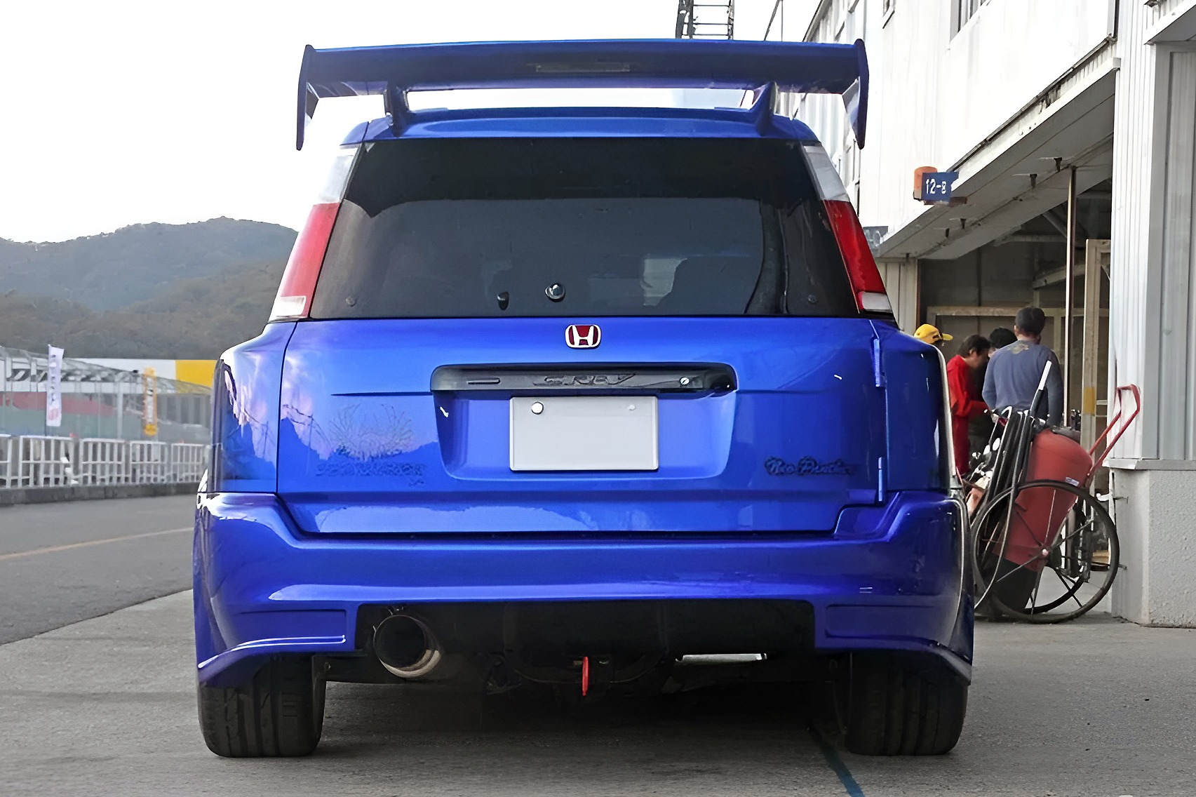 ボディはワンオフでワイド仕様とし、リヤスポイラーも製作。フロントのみならず、サイドやリヤのフォルムまで徹底的に拘ったのだ。また、あえてリヤゲートにホンダのエンブレム(赤バッチ)を残しているのもニクい。