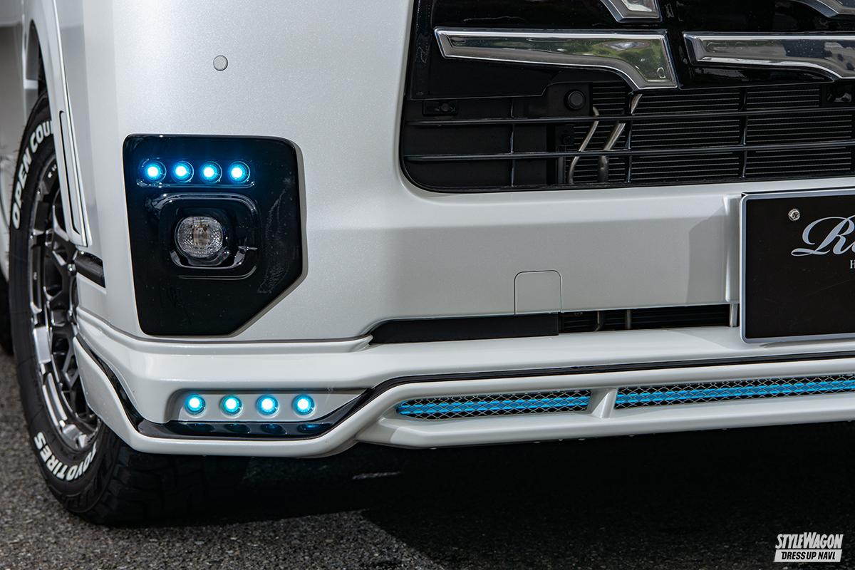 比較的シンプルなデザインに徹するブランドがある一方で、ロェンが目指したのは付けた感が明解な、強い自己主張性だ。ハーフは加飾範囲が限られるためデザインに制約がかかる傾向にあるが、そこは数多くのエアロを開発してきたこれまでの知見を活用。エアロの効果がハッキリわかる凹凸性に富んだ、ロェンいわく“挑戦的”なデザインをカタチにした。パーツは大小数多くあるが、なかでも注目はLEDを駆使した+αな光技だろう。フォグまわりからフロントスポイラー内、さらに光がパフォーマンスするルーフスポイラーと、差が付くパーツがいろいろある。