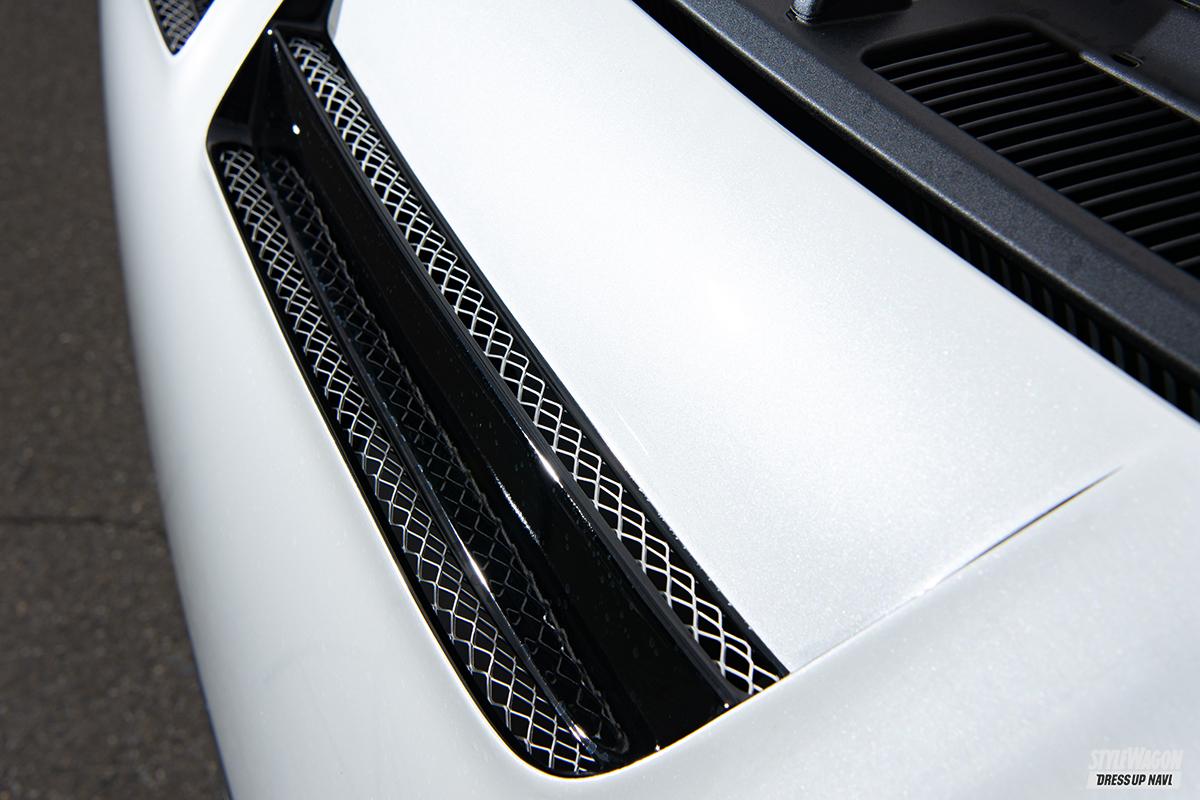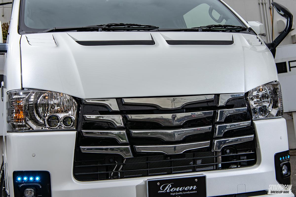 比較的シンプルなデザインに徹するブランドがある一方で、ロェンが目指したのは付けた感が明解な、強い自己主張性だ。ハーフは加飾範囲が限られるためデザインに制約がかかる傾向にあるが、そこは数多くのエアロを開発してきたこれまでの知見を活用。エアロの効果がハッキリわかる凹凸性に富んだ、ロェンいわく“挑戦的”なデザインをカタチにした。パーツは大小数多くあるが、なかでも注目はLEDを駆使した+αな光技だろう。フォグまわりからフロントスポイラー内、さらに光がパフォーマンスするルーフスポイラーと、差が付くパーツがいろいろある。