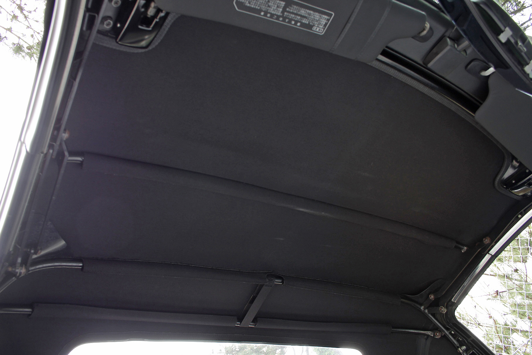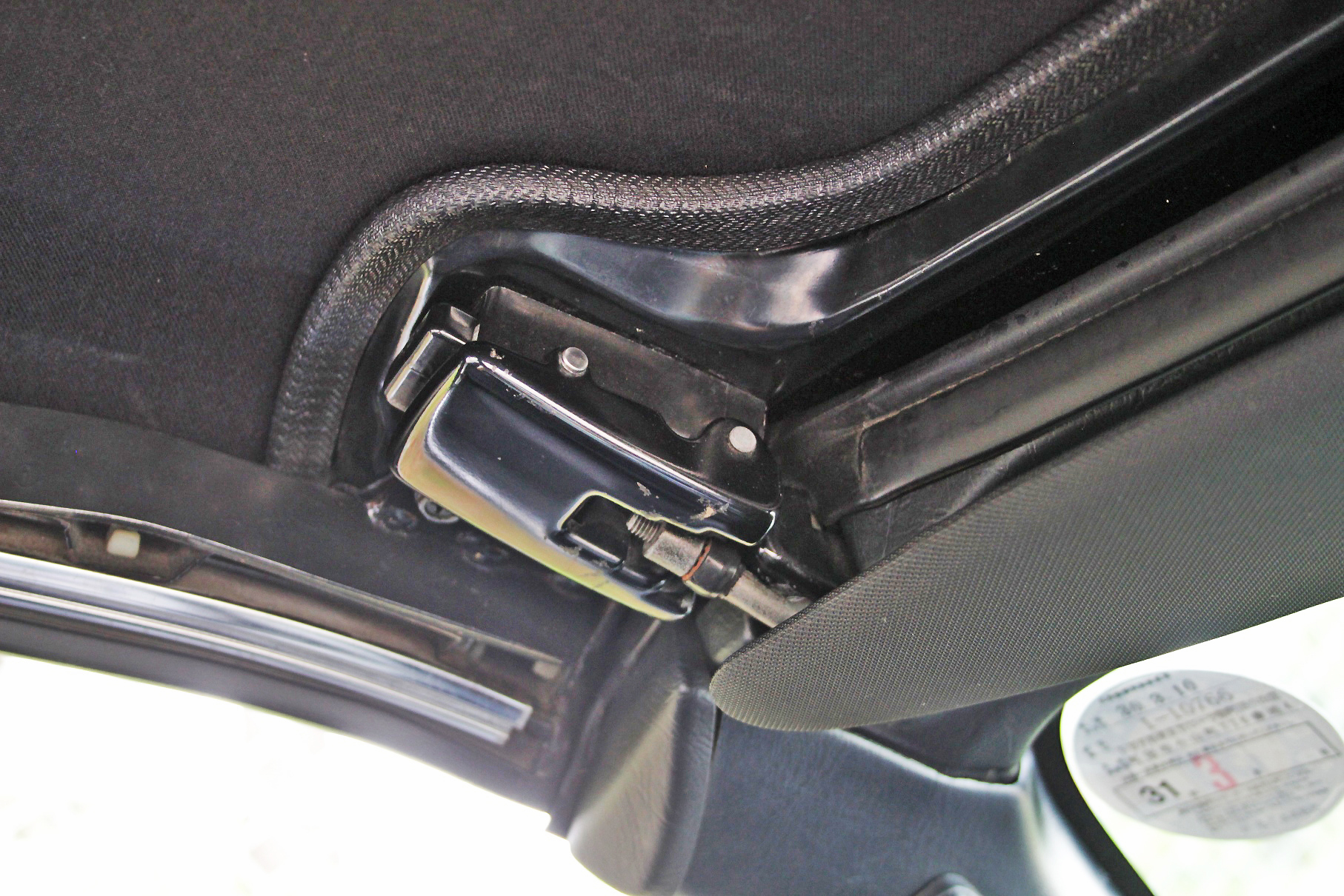 取材車両のソフトトップは傷みが激しかったこともあって、フレームを活かしながら新たにキャンバス地でリメイクしたそうだ。ソフトトップはフロントロック2ヵ所、クォーターピラーロック2ヵ所、ホック15ヵ所で固定される。