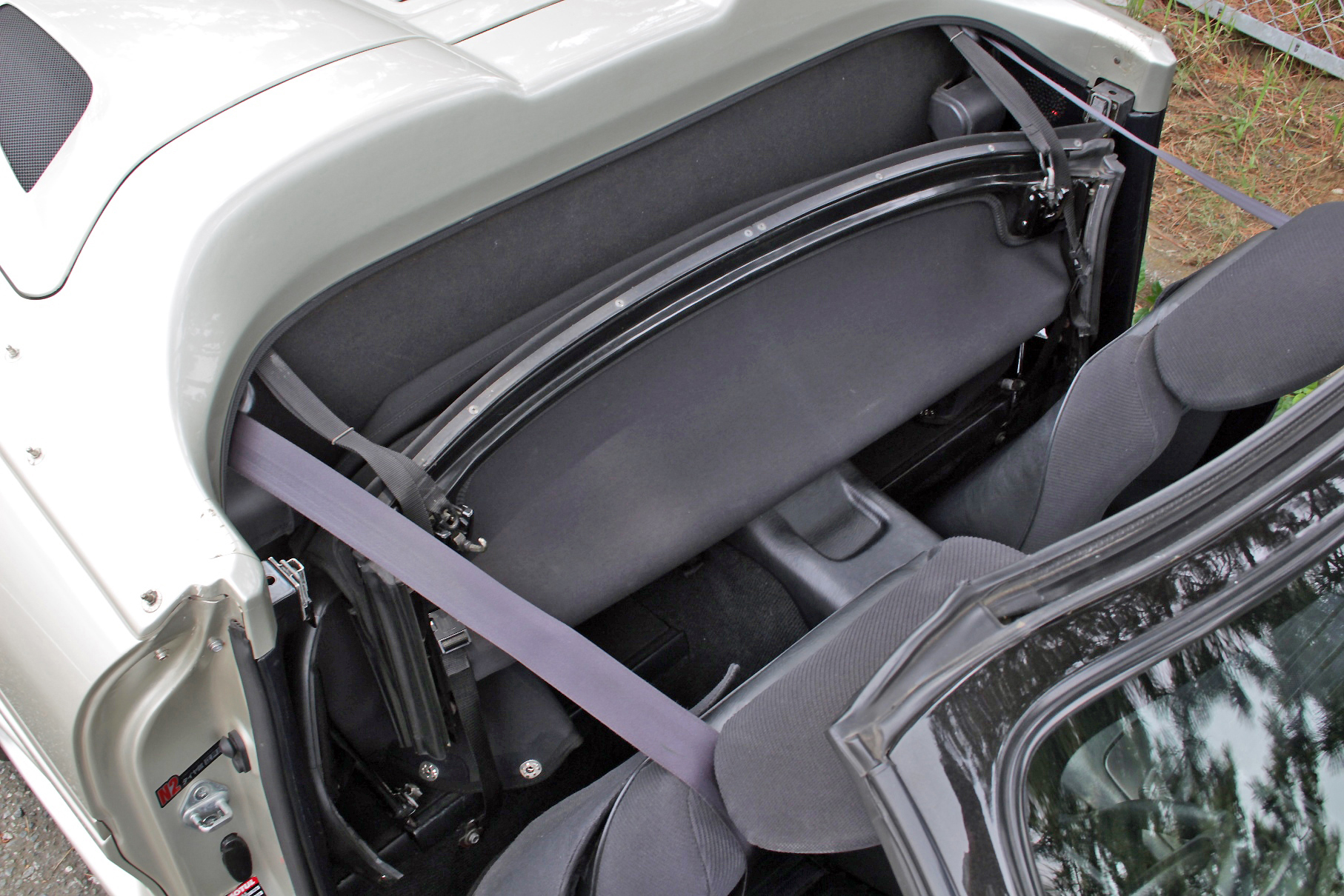 ソフトトップは開閉式でなく脱着式というのが他の国産オープンカーとの大きな違い。取り外したら折り畳んでシート後方のスペースに収納する。フロントロック2ヵ所にベルト&フックを引っかけて固定できるようになっている。
