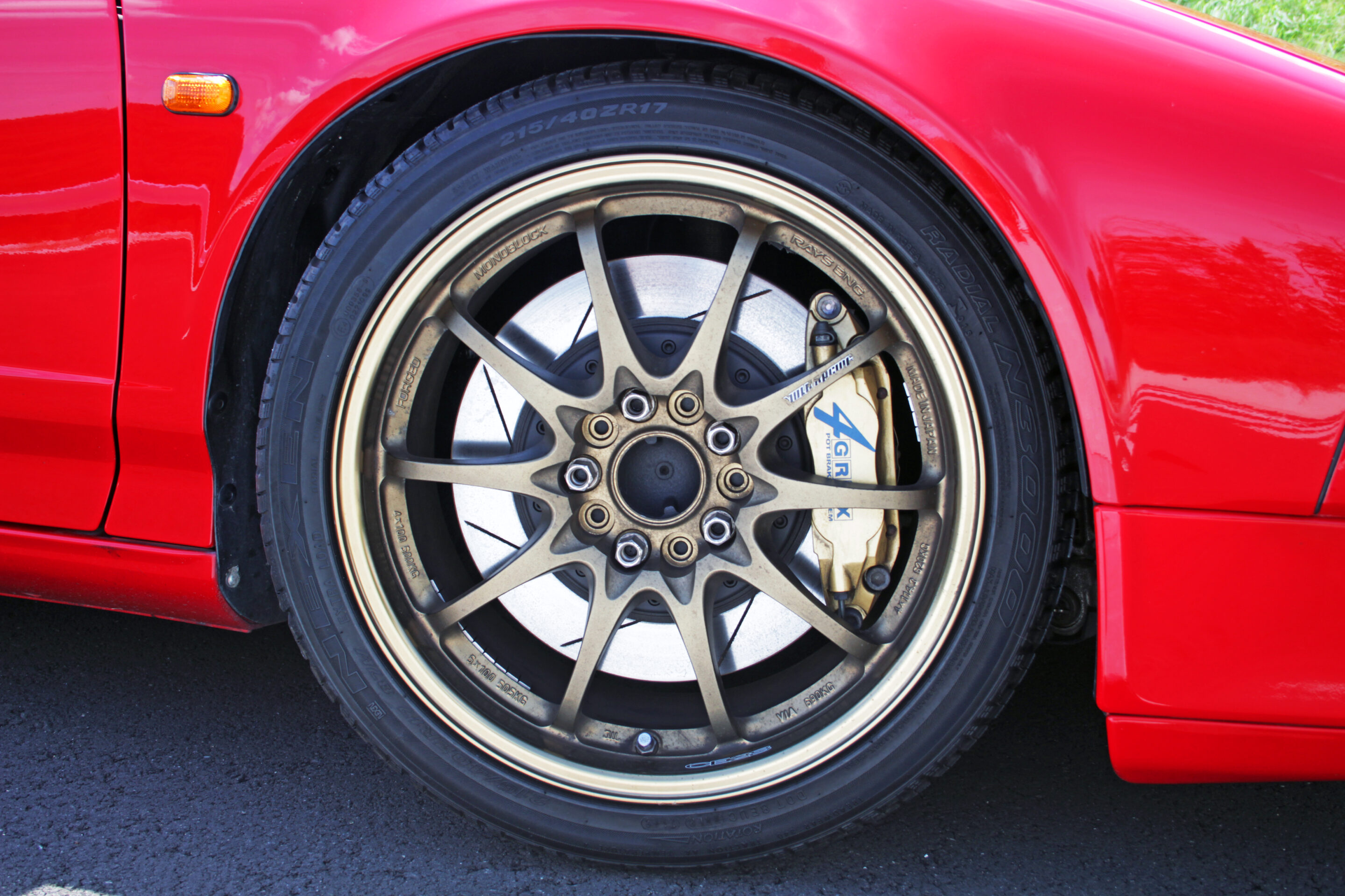 足回りは、エンドレスの車高調とOS技研のスーパーロックLSDでセットアップ(ファイナル4.4)。ホイールはボルクレーシングの中でも特に軽さを売りにしていたCE28Nで、標準のフロント15/リヤ16インチに対して、17/18インチへと2インチアップが図られた。スポークの隙間から覗くブレーキシステムは往年のトラストGREXだ。