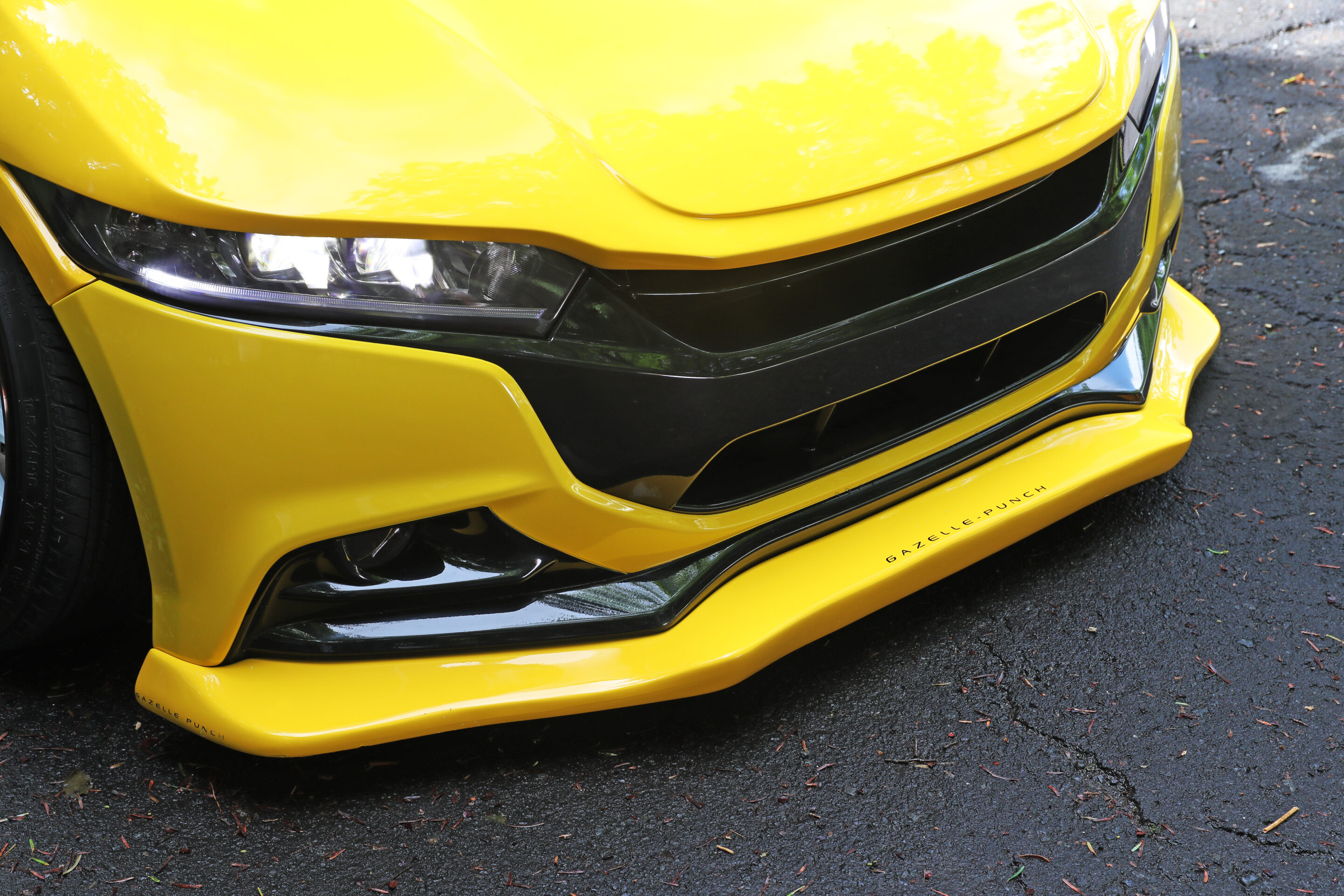 ガゼルパンチのモットーは「車高を低く見せつつも、実用性は損なわない」というもの。そのため、リップ部に装着されるフラップは、しゃくれた形状で路面に擦りづらい形状を採用。さらに、フロントに165/45−16、リヤに185/35−17と純正よりも大径なタイヤを合わせることで、十分なロードクリアランスも確保しているのだ。