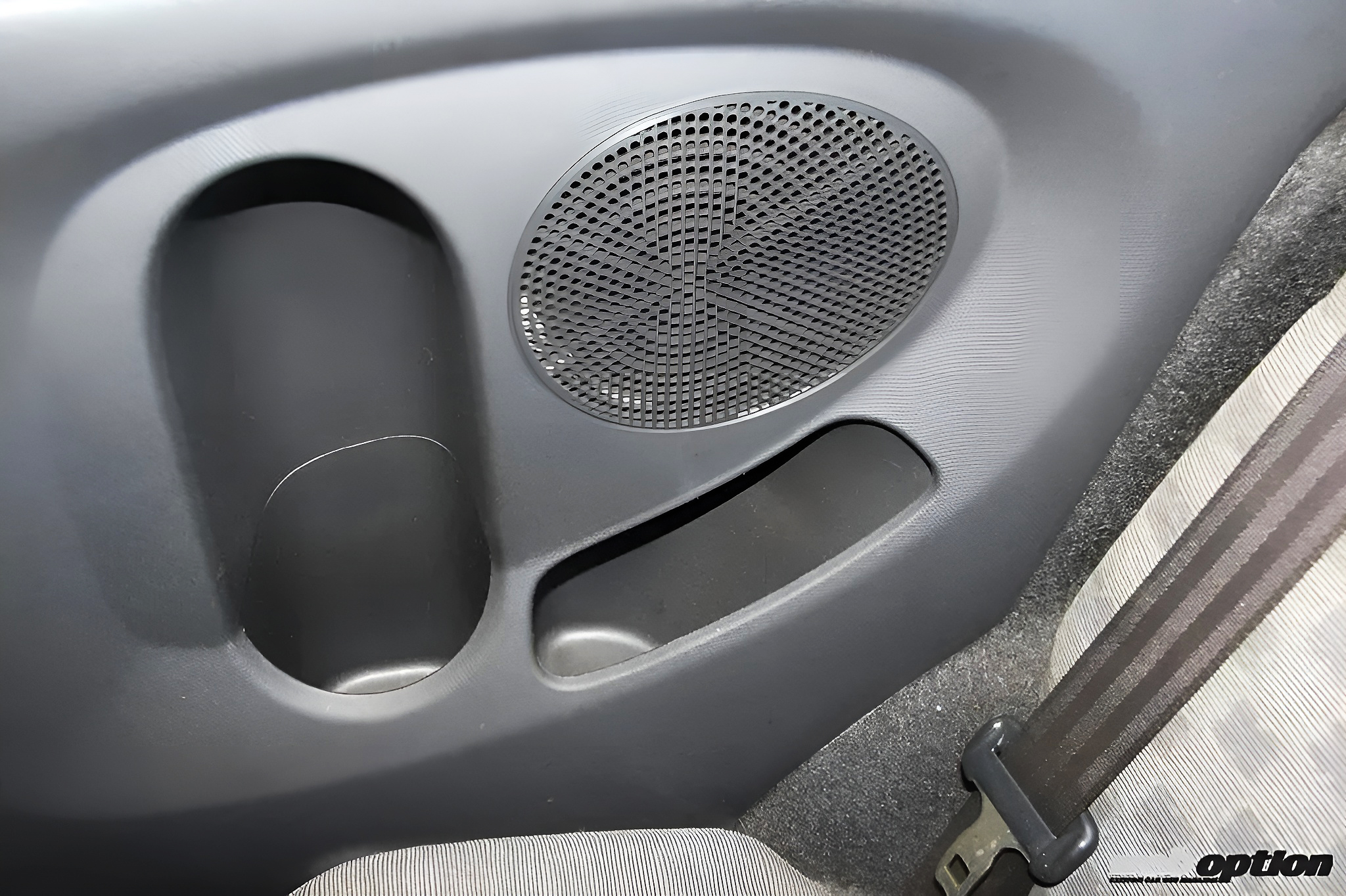 ヘッドレストが装備されず、背もたれが一体で可倒する10bの後席。大人2人が乗るには十分なスペースが確保されている。また、3ドア車は後席左右の内装トリムにボトルホルダーや小物入れを完備。これはなかなか実用的だ。