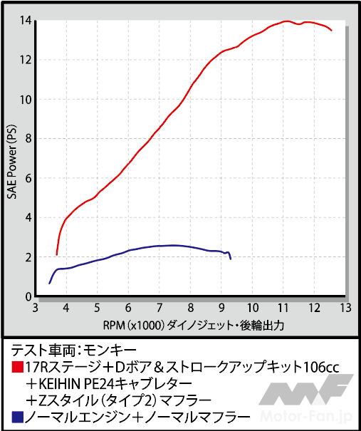 オンロード 「ノーマル風でここまで速い」8インチ×106ccの“真似したくなる”SP武川王道ゴリラチューン【写真・2枚目】 8インチの軽快な車体に106ccのハイパワーを詰め込んだ一台。スロットルを開けた瞬間に体が持っていかれるような加速で、見た目とのギャップが強烈だ。 ノーマル風の外観を保ちながら、中身は106cc化された高効率エンジン。大径バルブや燃焼室の最適化により、SOHC2バルブとは思えない鋭い吹け上がりを実現している。 純正シルエットを大切にしたスタイリングが特徴のゴリラ。派手なカスタムとは異なり、“ノーマル然として速い”という完成度の高さが際立つ。 8cmロングのスイングアームを装着し、ホイールベースを延長。強烈な加速によるフロントリフトを抑えるためのセッティングであり、安全性と走行安定性を両立する。 足周りはテレスコピックフォークとディスクブレーキ化などで強化され、エンジン性能に対応。小径ホイールならではのクイックな挙動を活かしつつ、高速域でも破綻しないバランスに仕上げられている。 スペシャルパーツ武川の17Rステージ+Dボア&ストロークアップキット106cc。ノーマルヘッド形状をベースに吸排気効率を高め、強化クランクと組み合わせることで高回転・高出力を実現する。 実測約2.5psのノーマルに対し、106cc仕様は約14psまで向上。回転上昇とともに一気にパワーが立ち上がり、12000rpmまで伸びる特性がグラフからも明確に読み取れる。青線(ノーマル)との差は歴然だ。 この画像の記事を読む