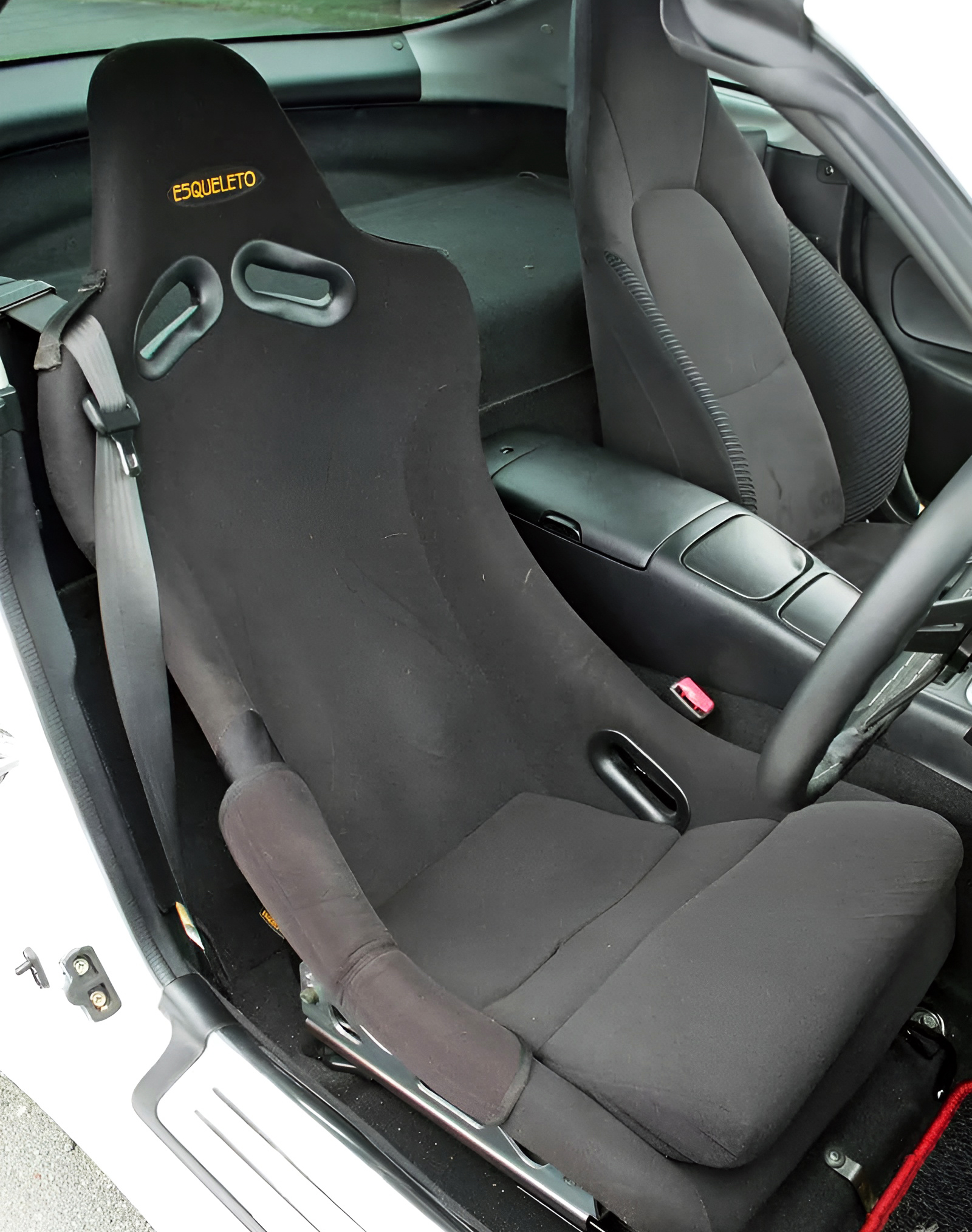 運転席はロードスター専用設計のフルバケットシート、エスケレートタイプ1。クッション材には低反発ウレタンが使われ、三次元成形された腰部と背面の形状によりサポート性が高く、疲労感も抑えられる。専用ブラケットを使い、純正シートレールへの取り付けが可能だ。