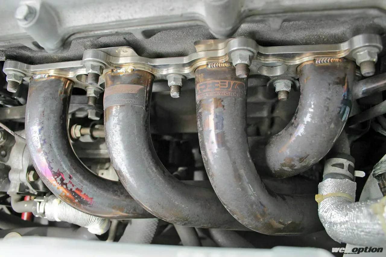 エンジン本体はノーマルで吸排気を軽くチューニング。EXマニは、マシニングセンターによる削り出しフランジを採用したマキシムワークス製TDエキゾーストマニホールドが装着される。オールステンレス製で42.7φ→48.6φ→54φの4-2-1タイプ。