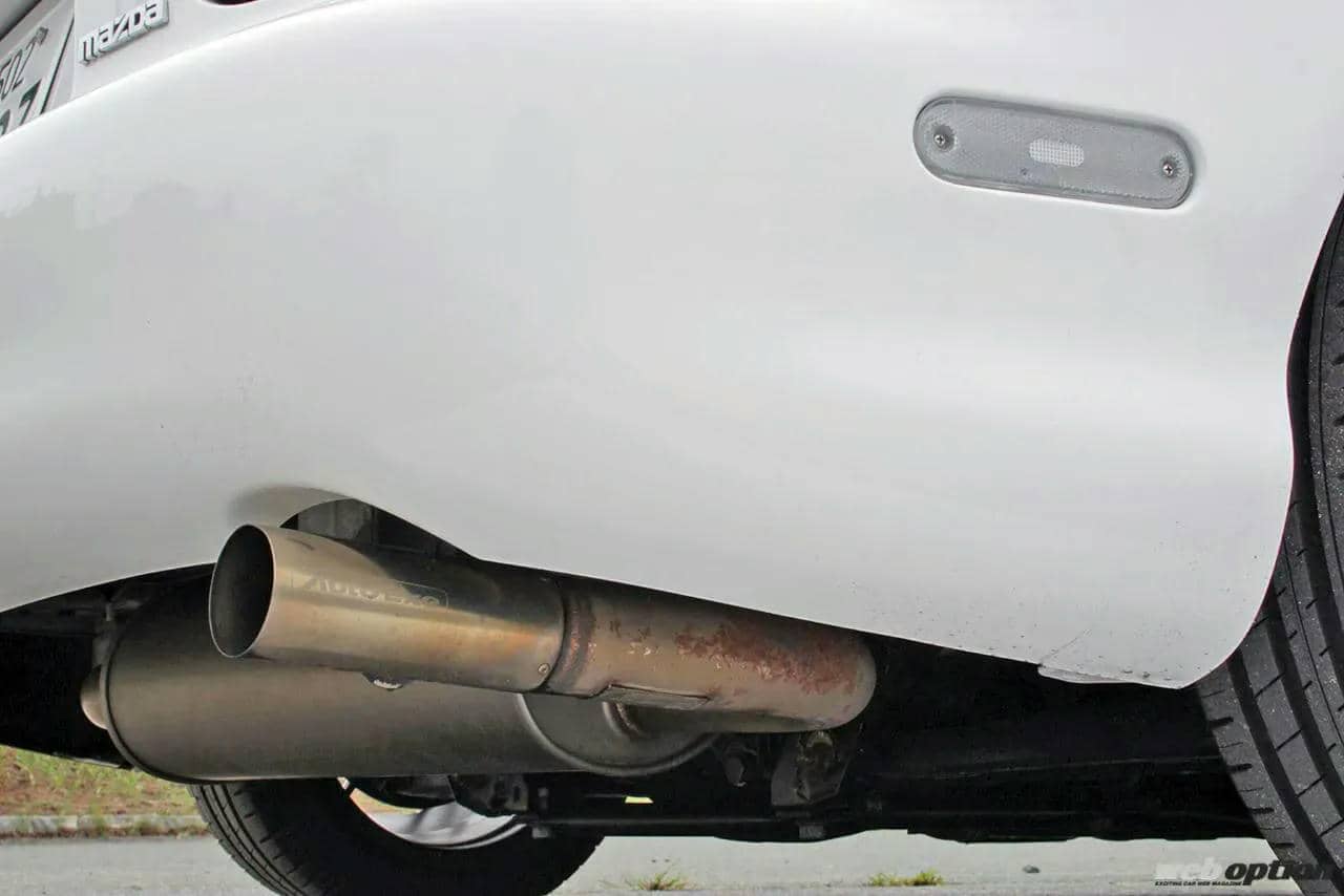 テールエンド側面にロゴが入るオートエクゼ製エキゾーストマフラー。マキシムワークス製EXマニと併せて全回転域でのレスポンスアップを約束する。また、中高回転域においてはノーマルを上回るパワー感と、NAエンジンらしいカン高く乾いたエキゾーストサウンドも楽しませてくれる。