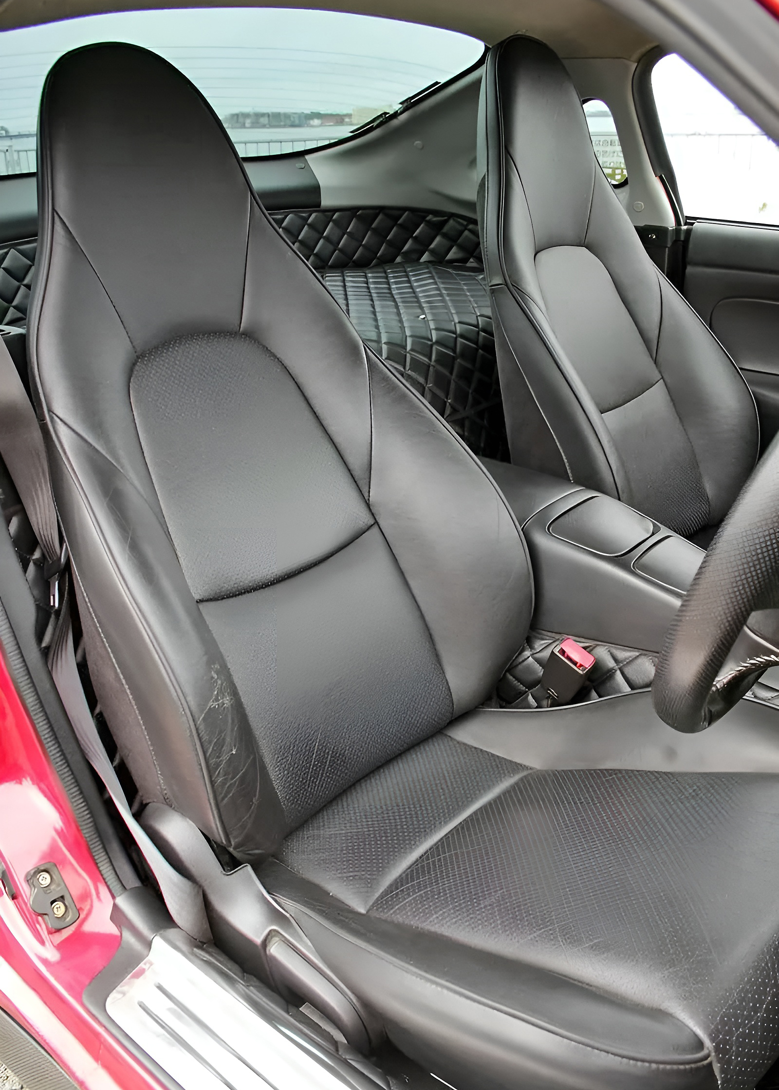 タイプAはブラックの本革シートが標準。タイプEはベージュの本革、ベースグレードとタイプSは撥水加工されたブラックのクロス製となる。また、取材車両はフロアトンネル周辺やシート直後のコンパートメント部をナカマエ製作のキルティングレザーマットでカバー。上質感をさらに高めている。