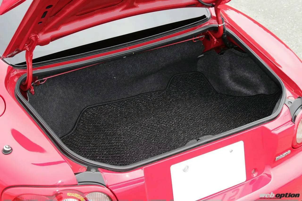 ラゲッジスペースはロードスターよりも室内側(奥)が深い分、クーペの方が容量も大きそう。トランクパネルはクーペ専用品で、トランクを開ける時にアシストしてくれるトーションスプリングも強化型となる。ちなみに、トランクのウェザーストリップはもう純正部品が出てこないとか。