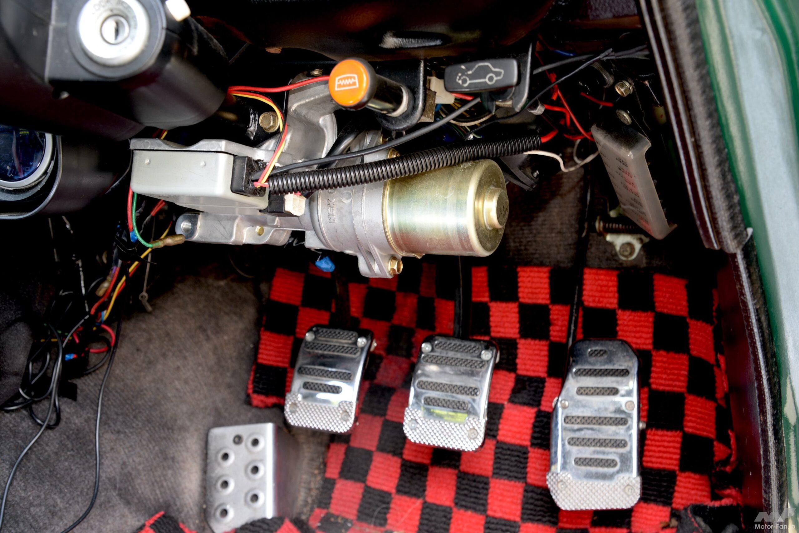 さらにパワーステアリングは油圧ではなく簡単に追加できる電動パワステを選んでいる。ユニットは個人で製作している人を見つけ、シャフトを加工せずに装着できるものを手配した。シャフトを加工すると改造公認車検を取得しなければならなくなるからだ。部品が届くと装着は堀内さん自ら行っている。