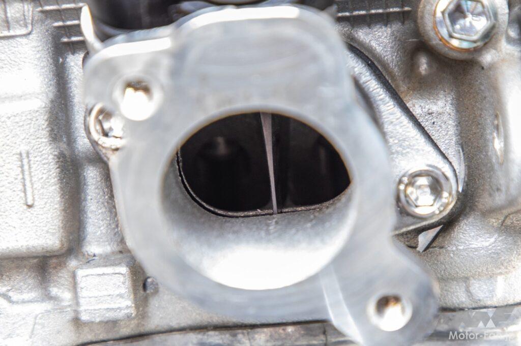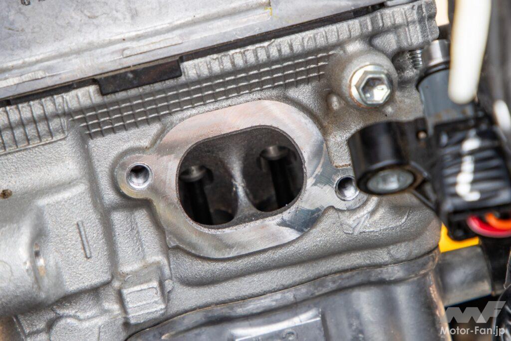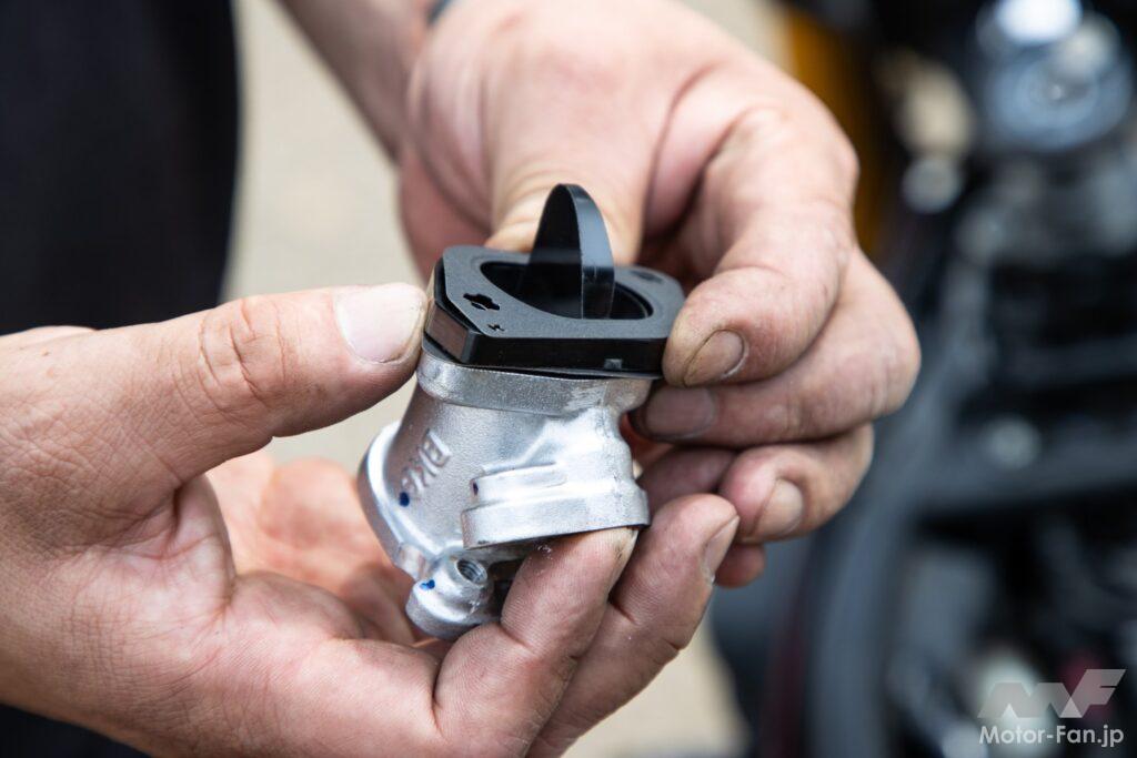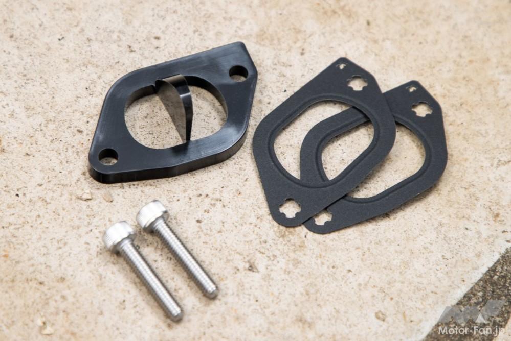試すのは、台湾の人気パーツメーカー「KOSO(コーソー)」のインテークレクチファイア。具体的には、インテークマニホールドとシリンダーヘッドの間に挟むスペーサータイプのパーツで、内部に仕切りのような板があるのが特徴です。この仕切りによって吸気の流れを整え、吸入効率やレスポンスの向上を狙うという仕組み。