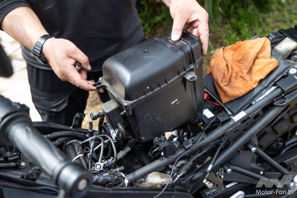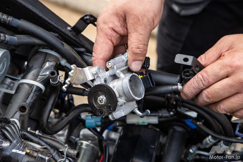 最初は車体の横からアクセスして作業できないか?考えましたが、結論としてはしっかり分解したほうが早いです。シート、外装、燃料タンク、エアクリーナーボックス、スロットルボディと順に外していくとインマニにアクセスできます。最近のバイクはボルトも少なく、慣れればテンポよく進められます。