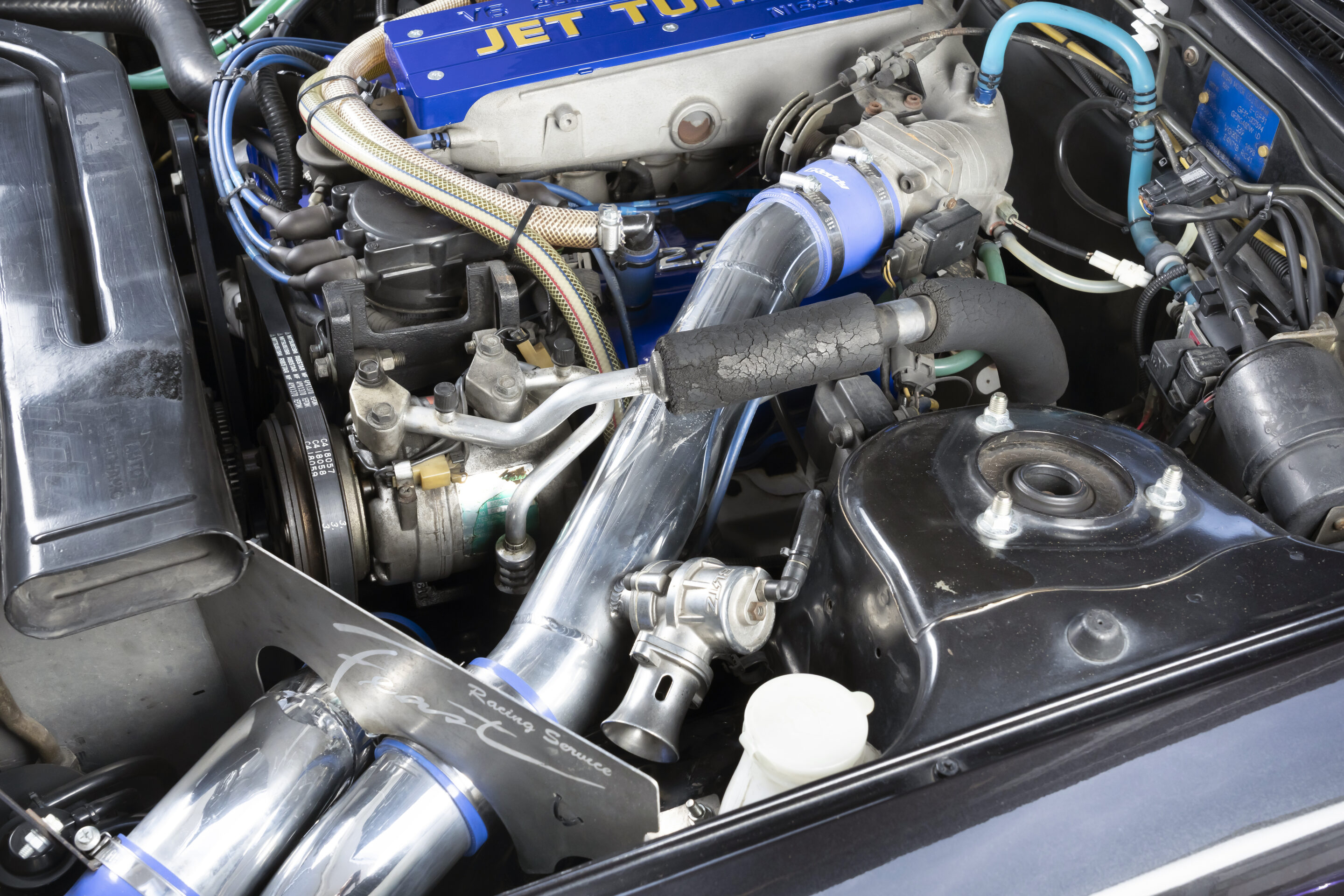 VG20ET用に設定されたパーツが少ないため、補機類も流用とワンオフで構築。SR20DE用スロットル、JZX100用ブローオフをワンオフパイピングと組み合わせた。