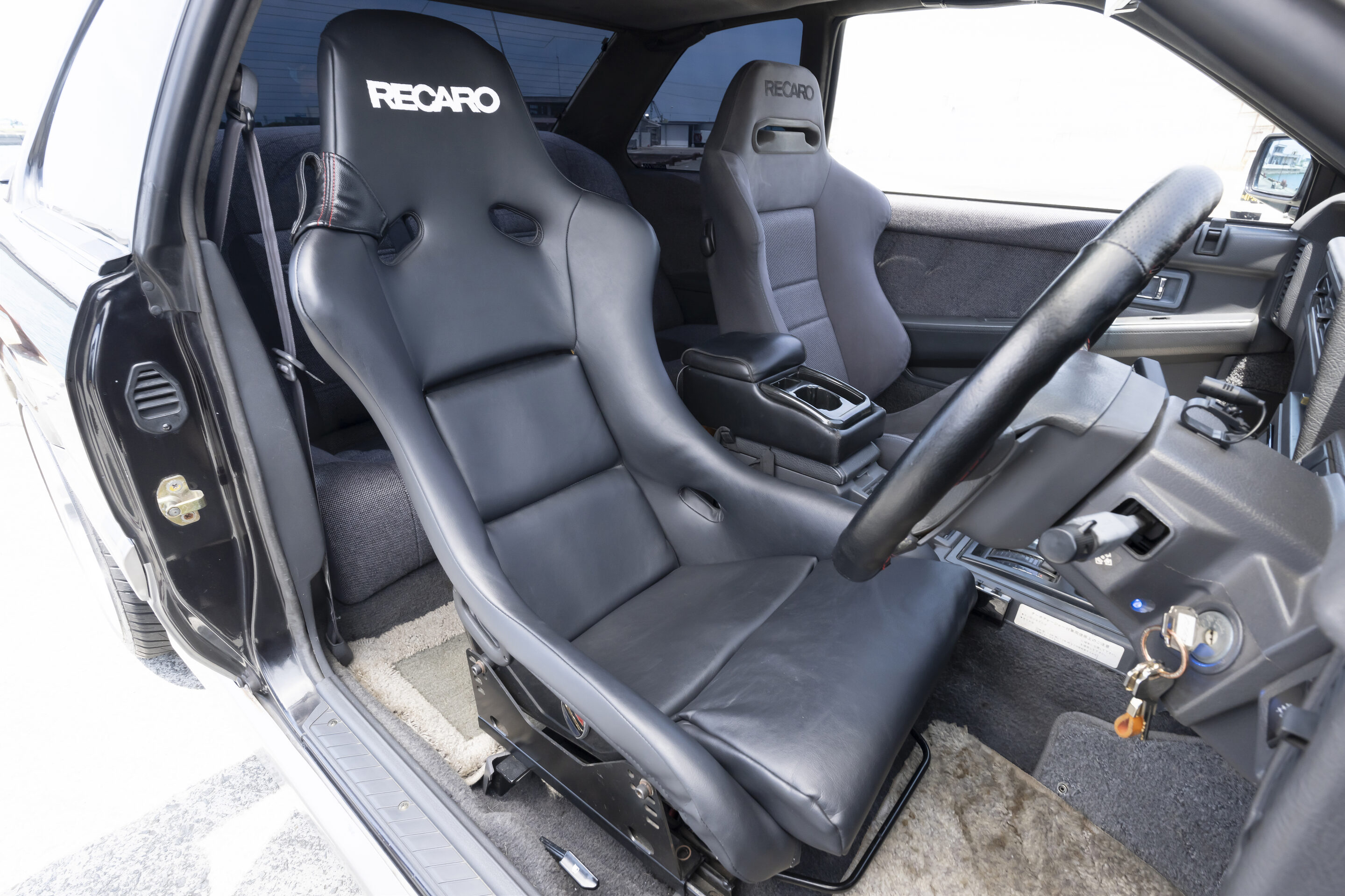 長距離走行での疲労軽減を重視して、運転席にはブラックレザーに張り替えたレカロSP-Gポールポジション、助手席にはランエボⅢ純正レカロをセットする。