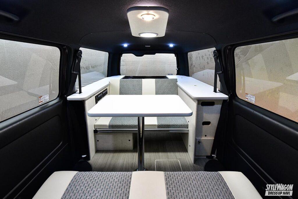 こちらのハイエースも対面座席やベッドなど3パターンのモードからアレンジでき、居心地の良い室内空間を作り上げている。