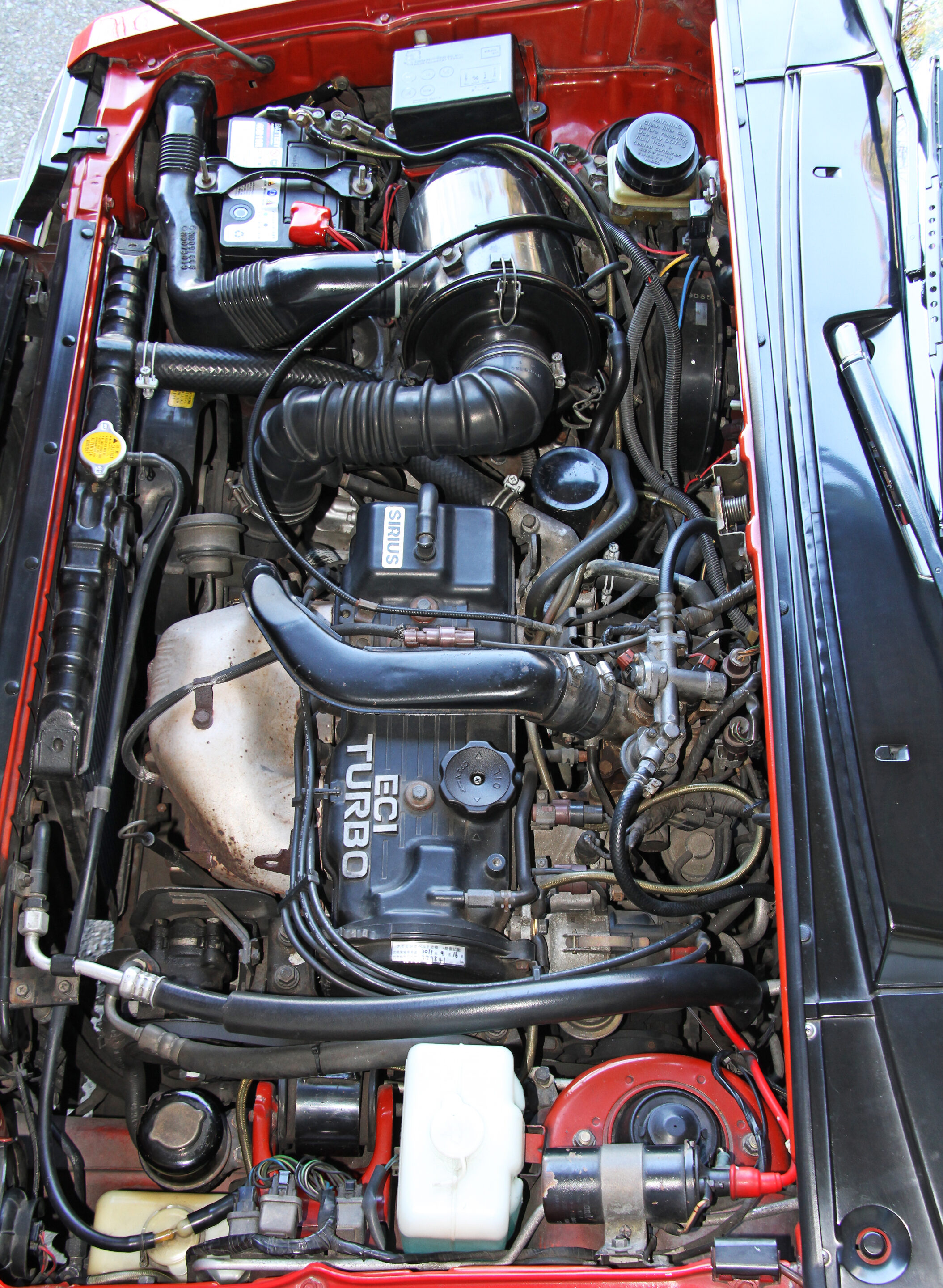 前ヒンジのボンネットを開けると現れるのは、インタークーラーレスのA175ランタボ前期型と同じ1.8L直4SOHCターボのG62B“シリウス”エンジン。1.8L NA(G62Bとはストローク違いのG37B)の85psから50psのドーピングを行ない、135psを絞り出していたのだから驚かされる。