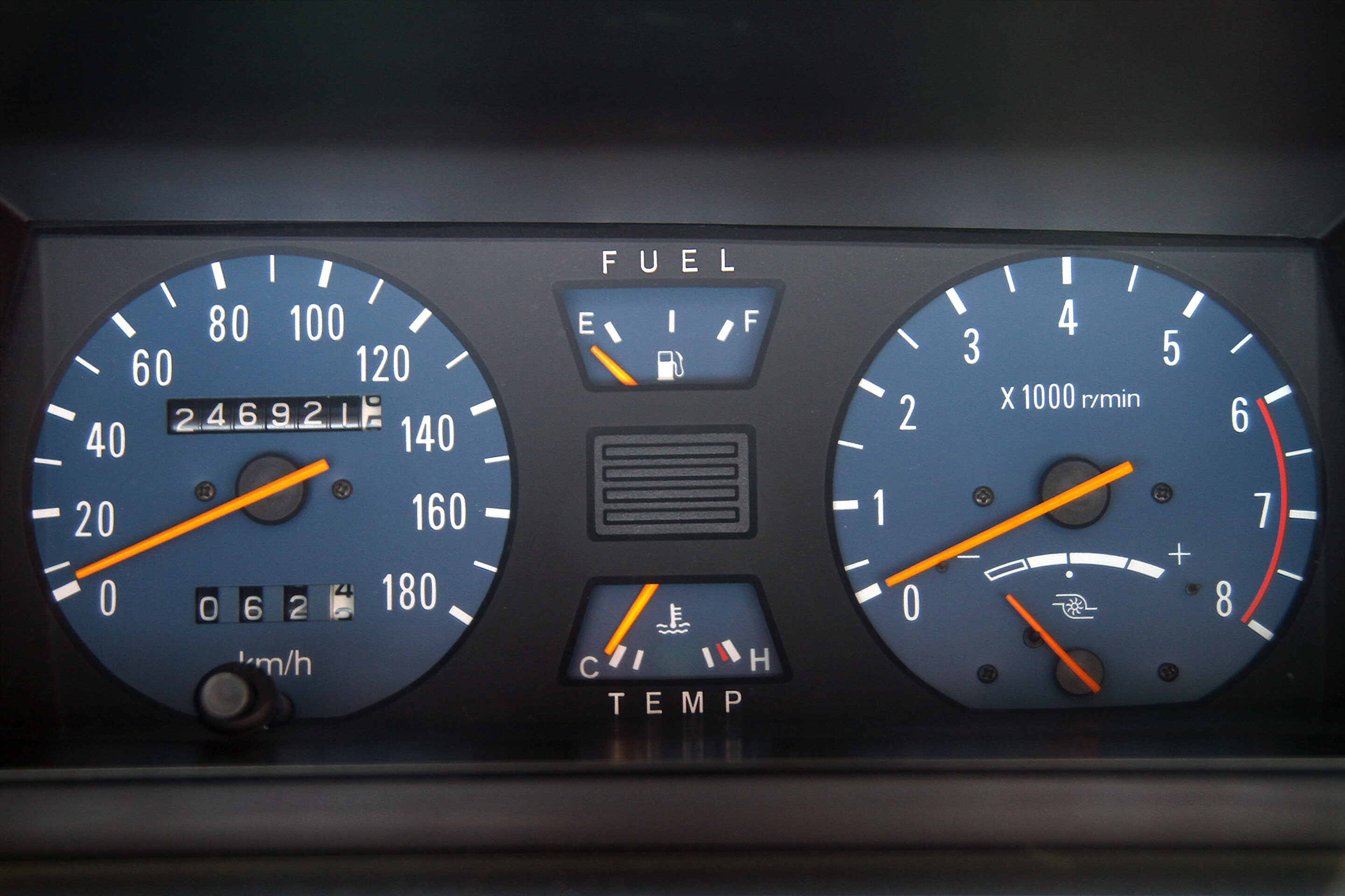 室内に目を移すと、まずステアリングハンドル中央のホーンパッドに堂々と“TURBO”の文字。トレイ状になったダッシュボード上部や助手席前の2段式グローブボックスなど使い勝手はよさそうだ。メーターパネルは右側にタコメーター(下にブースト計)、左側にスピードメーターが並び、その間に燃料計と水温計が上下に配置される。