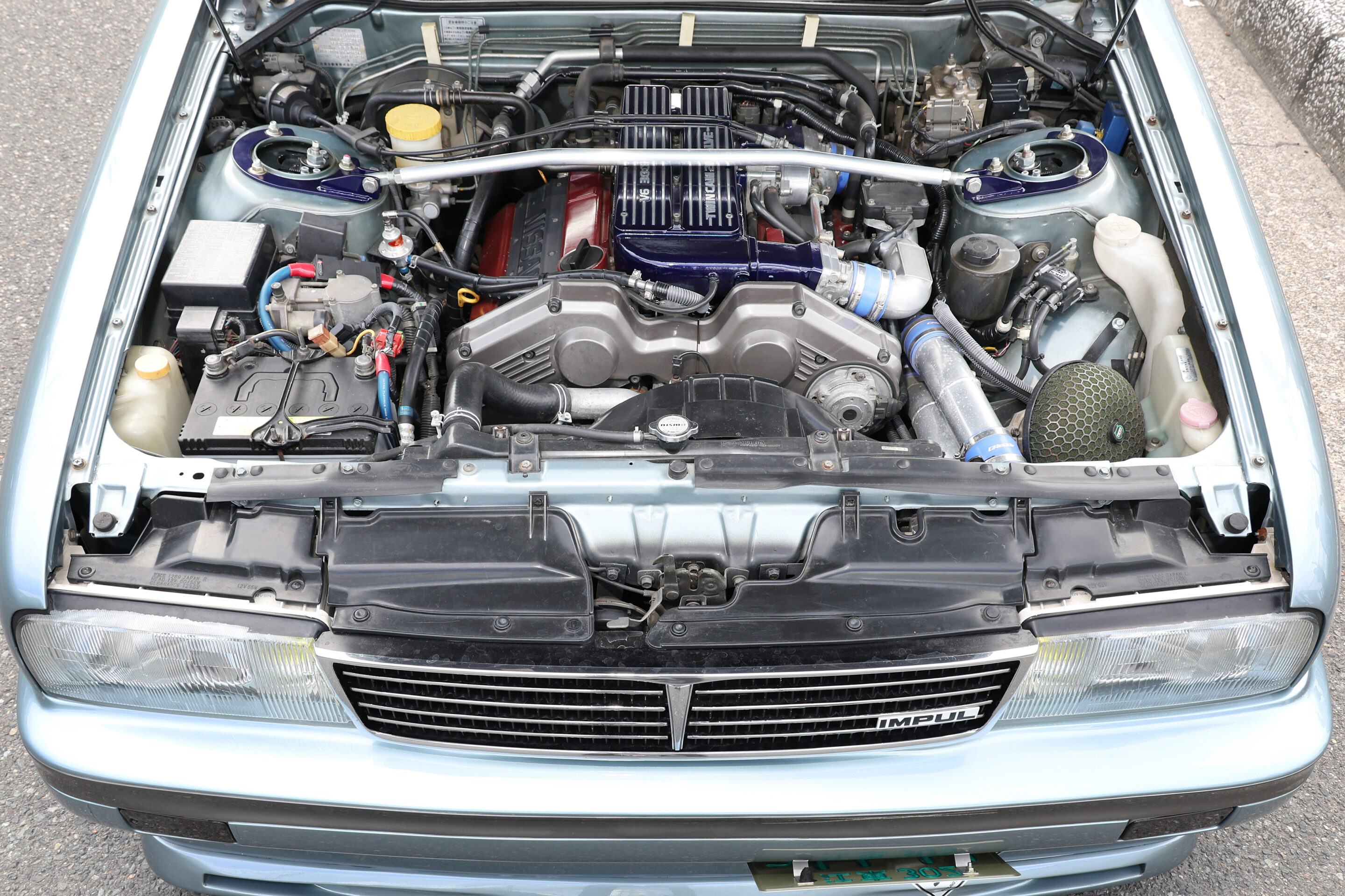 フロントバンパーの隙間から覗く前置きインタークーラー。Y31シーマ用の前置きインタークーラーの設定はなく、トラスト製のコアをベースにアヴァンツァーレでワンオフ製作した逸品だ。