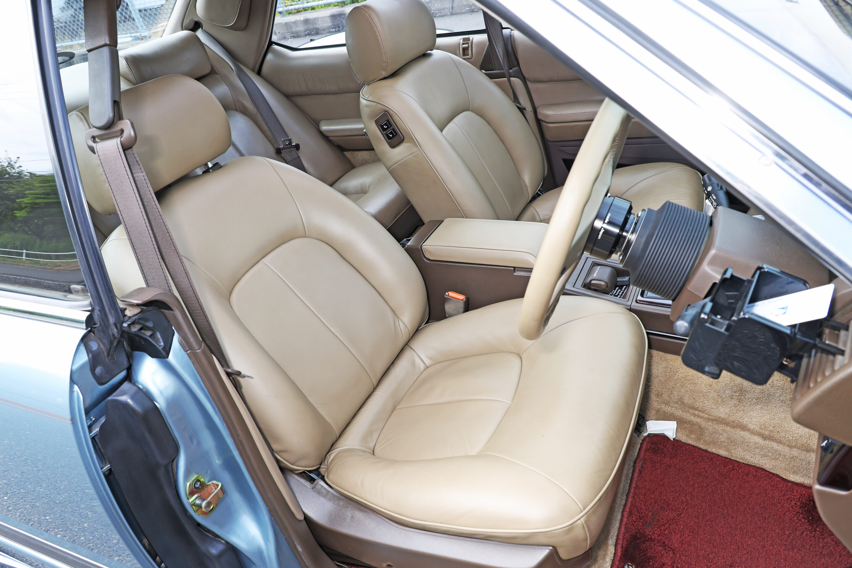 そのほか、トランク内にはオーディオ&エアサスのタンクをセンスよく配置し、魅せるインストールを実践している点も注目ポイントのひとつ。インテリアはヤレたレザーの張替えなどを行いつつ、やりすぎることなく当時の雰囲気を残しているところも好印象だ。
