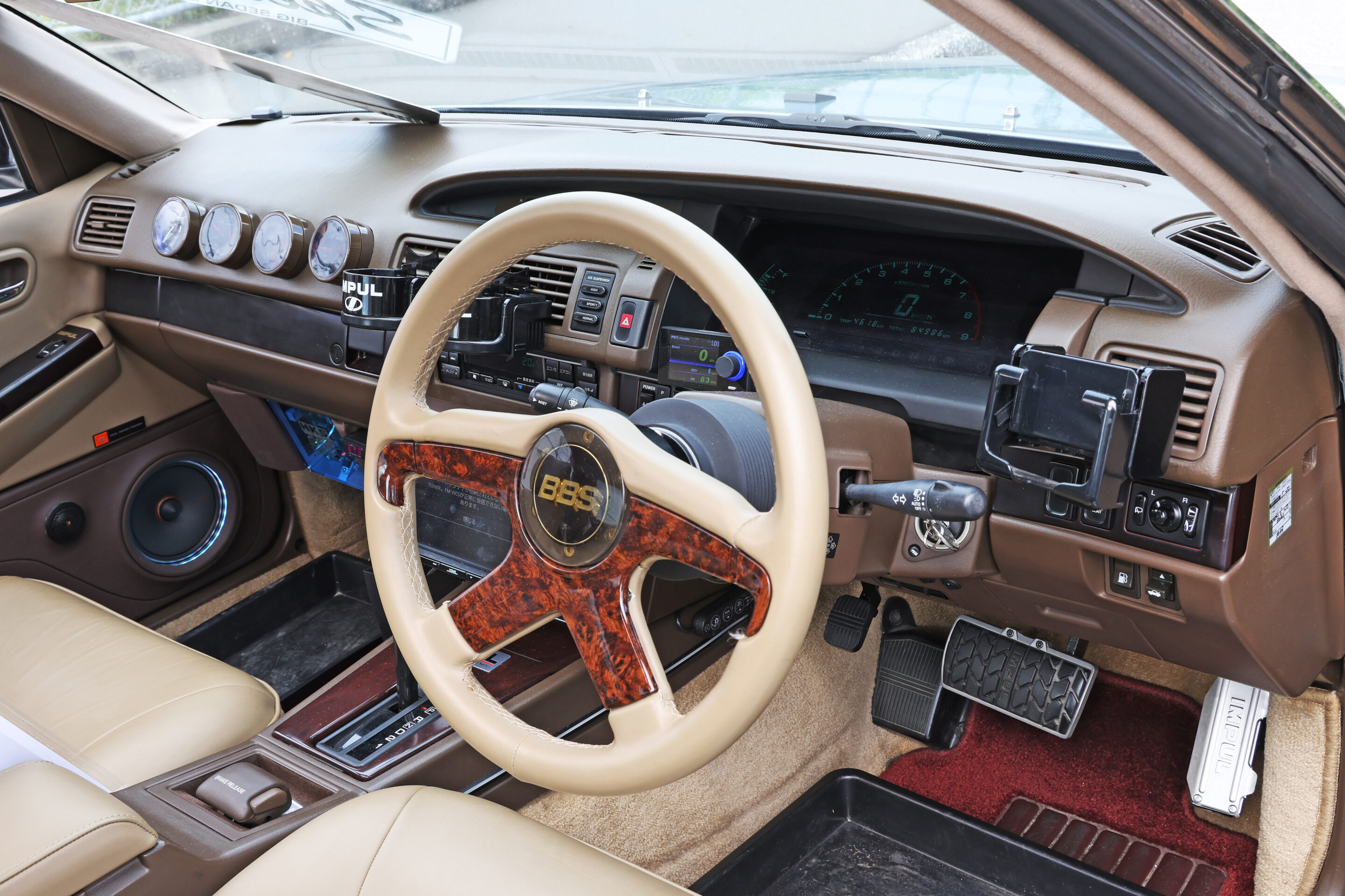 ベース車は、平成2年式の後期型グロリアシーマ。こだわったのが、サンルーフとデジパネの装備。特にデジパネは後期のみのメーカーオプションだったので、探すのに苦労したそうだ。カスタムについては全幅の信頼を寄せるアヴァンツァーレに依頼し、なんと3年の歳月をかけて完成にこぎつけたという。