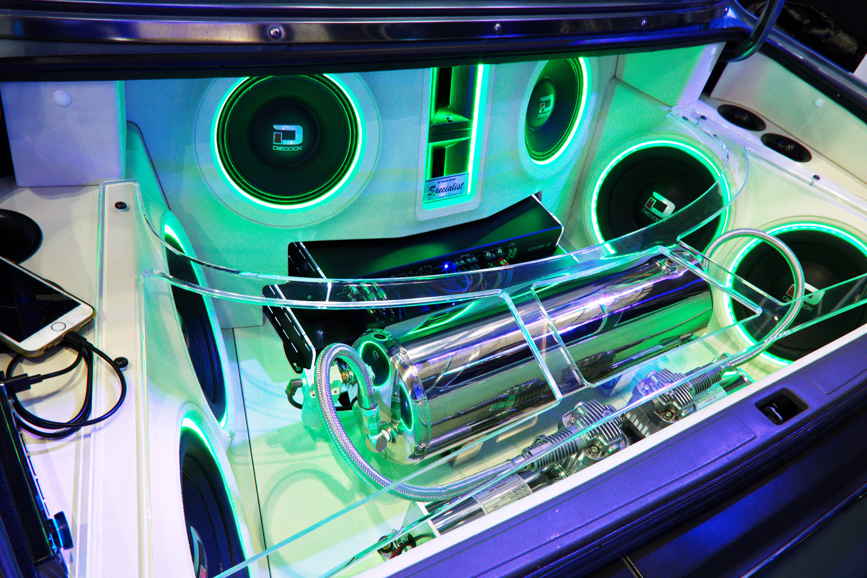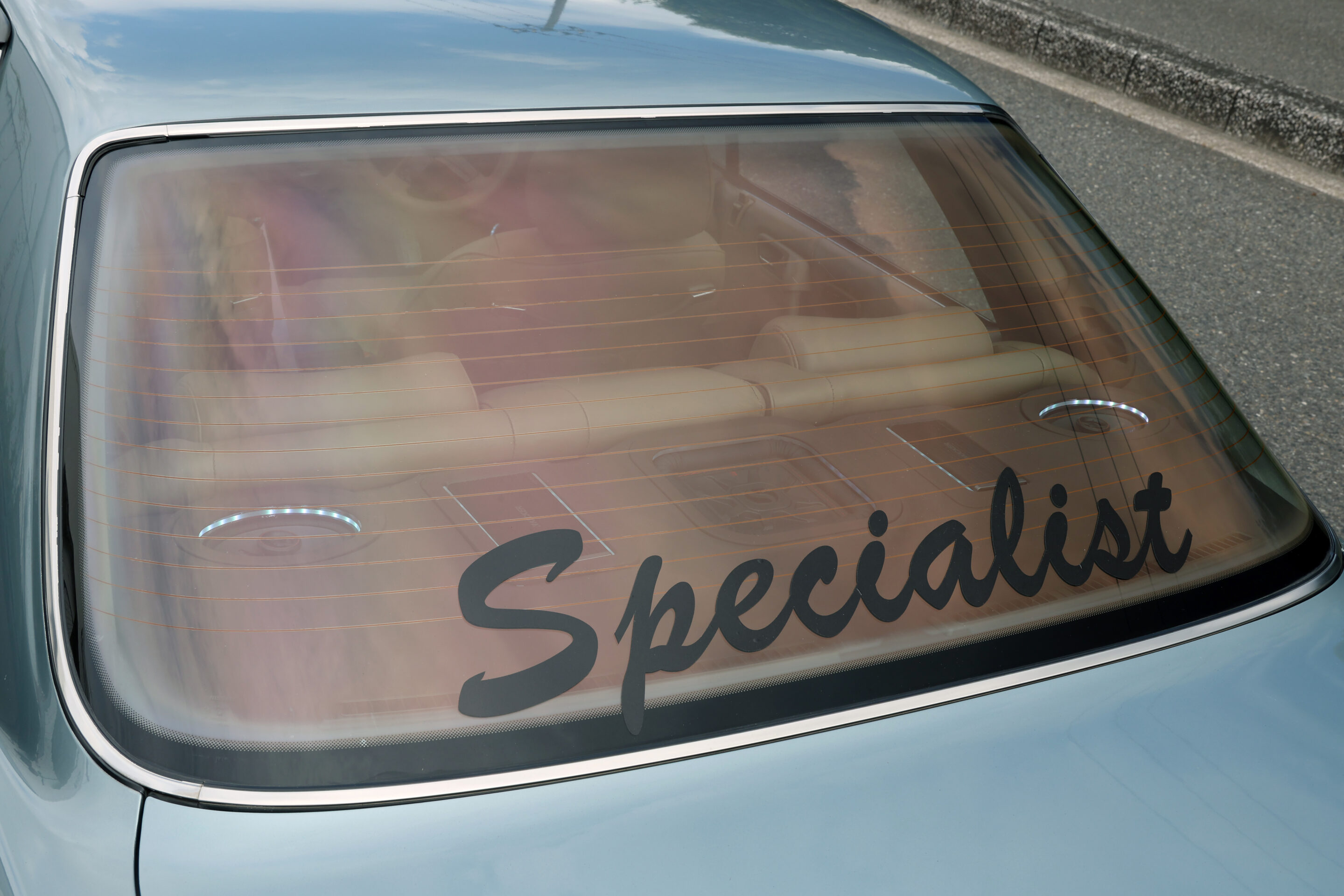 リヤトレーには、キッカーのスピーカー&ウーファーをインストール。また、ガラスやバンパーなどには、伝説的なVIPチーム「Specialist」のステッカーが貼られ、当時の雰囲気を醸し出している。ちなみに東雲太郎さんは、Specialistの4代目リーダーとして現在チームを牽引している。