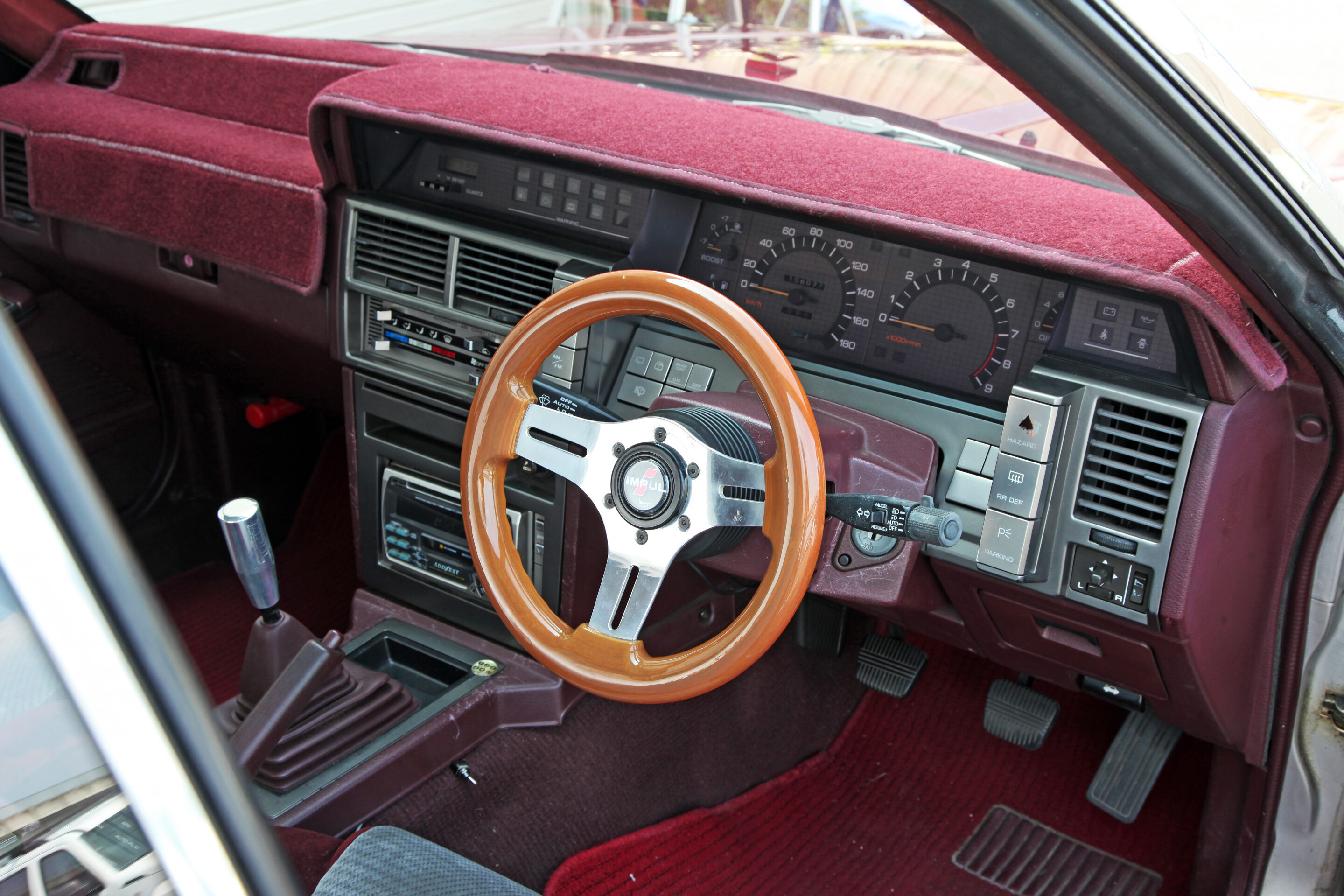 ステアリングホイールはクラシカルなイメージを醸し出すOBA製280φを装着。ホーンボタンとシフトノブはインパル製に交換される。意外だったのは、製品としてR31用ダッシュボードマットが存在していたことだ。