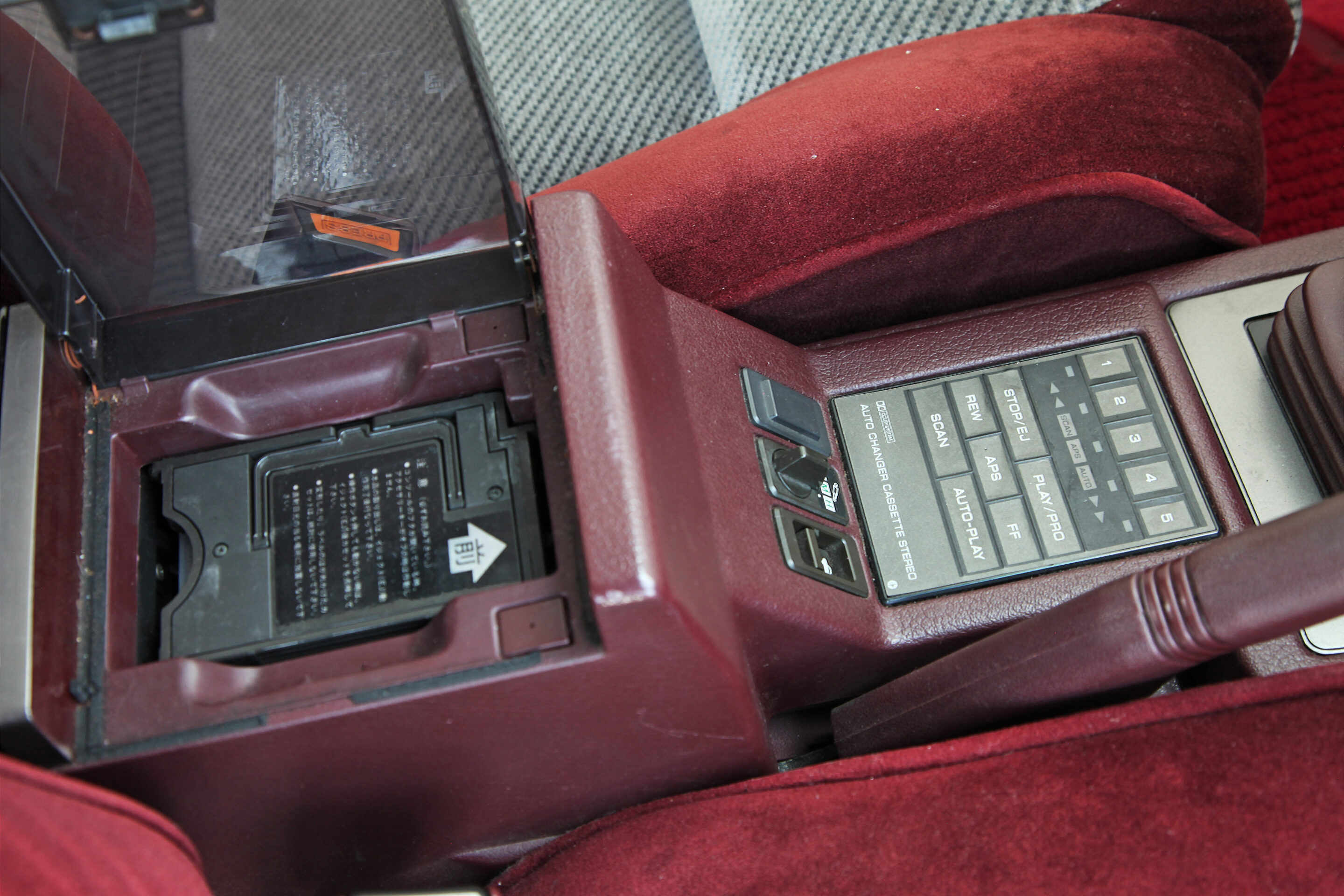 当時、R31やF31の純正オプションだったクラリオン製オートカセットセレクターを装備していたことに驚き。5本のカセットテープを装填できるカートリッジをセンターアームレスト部にセットし、シフトレバー後方のパネルスイッチで操作する。世界初を謳った日産自慢の装備だ。