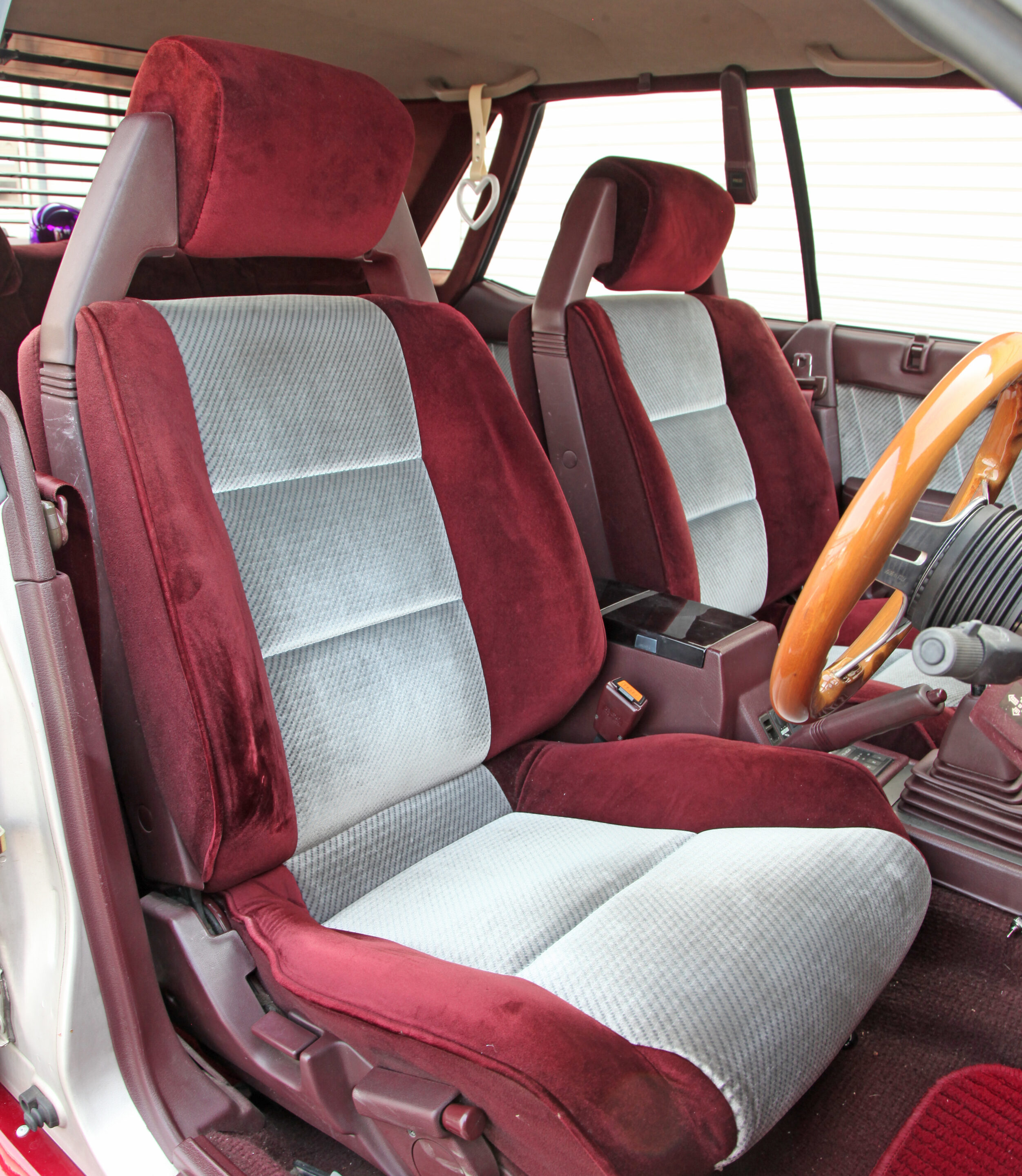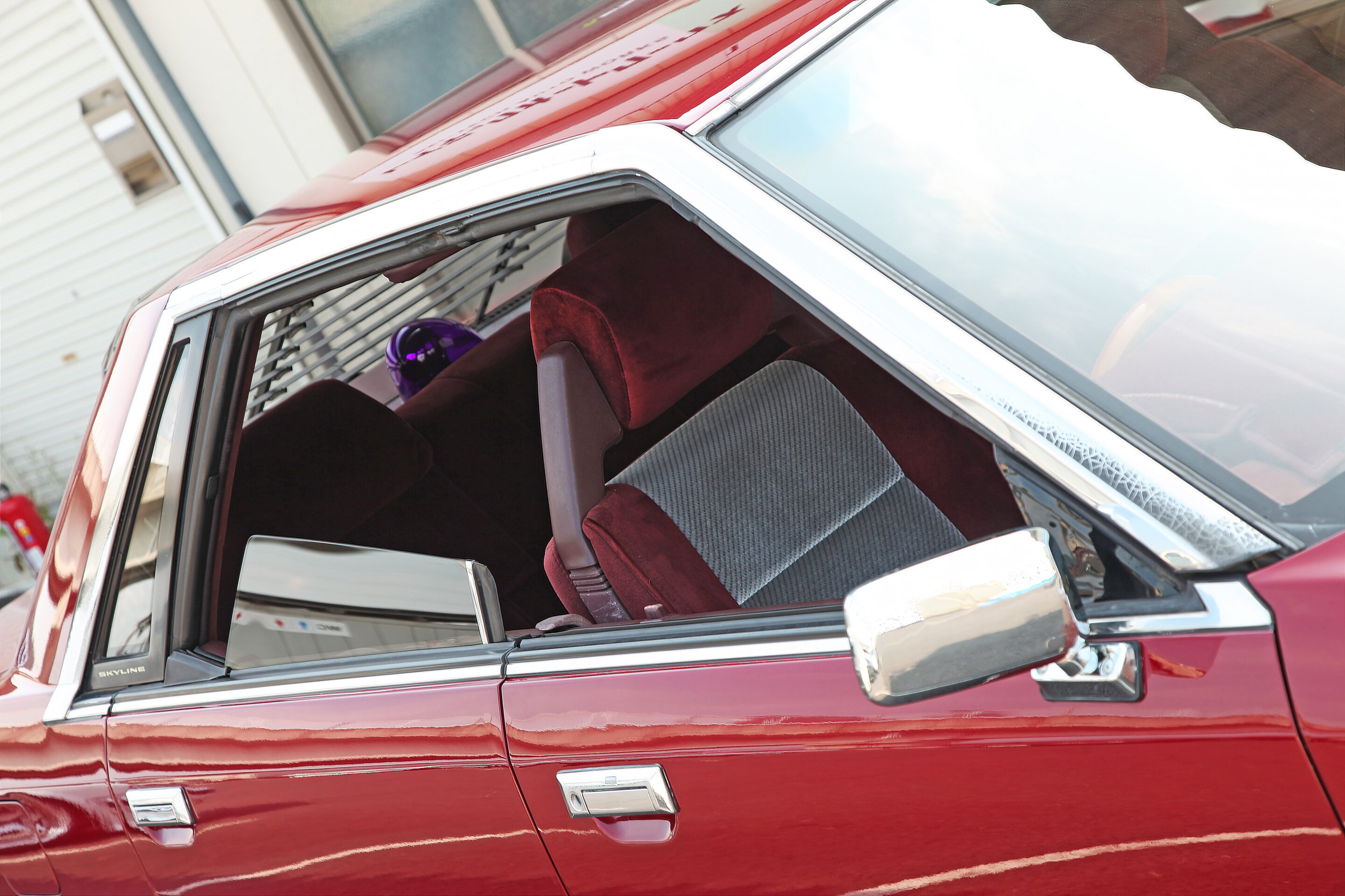 R31では珍しい赤内装。デザイン性も考慮したと思われる前席のヘッドレストは2本の棒を上から背もたれに差し込むのではなく、左右のアームで支持するタイプが採用される。R31のキャッチコピー、『都市工学』を思い起こさせる作り。