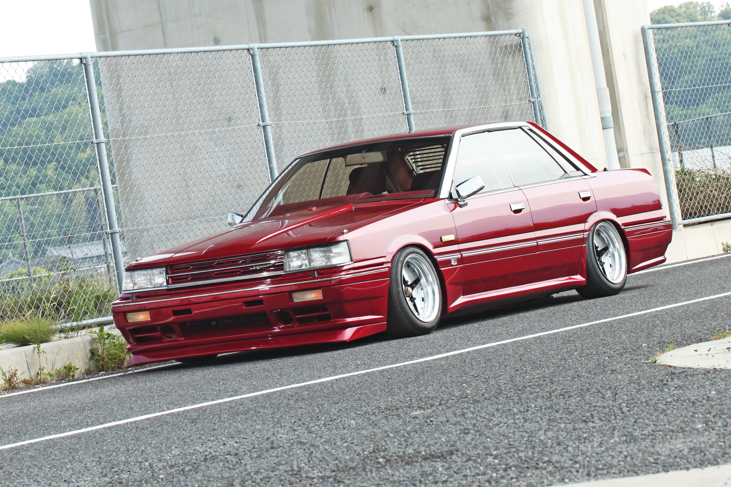 取材車両は前期型4ドアハードトップの最上級グレード、GTツインカム24Vターボパサージュ。210ps&25.0kgm(グロス表示)を誇る2.0L・直6のRB20DETを搭載し、ミッションには5速MTが組み合わされる。