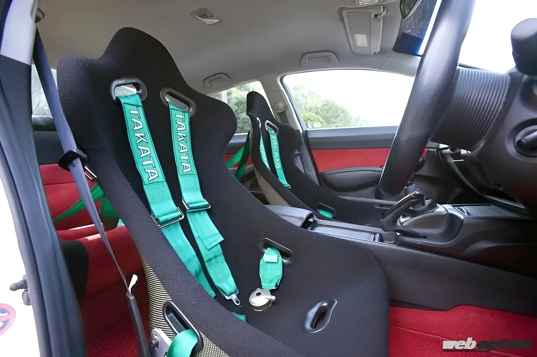 インテリアはノーマル然とした仕上がり。シートはスプーンが開発した5.7kgの軽量カーボンバケットタイプが与えられている。軽さはもちろん、ホールド性の高さもポイントだ。