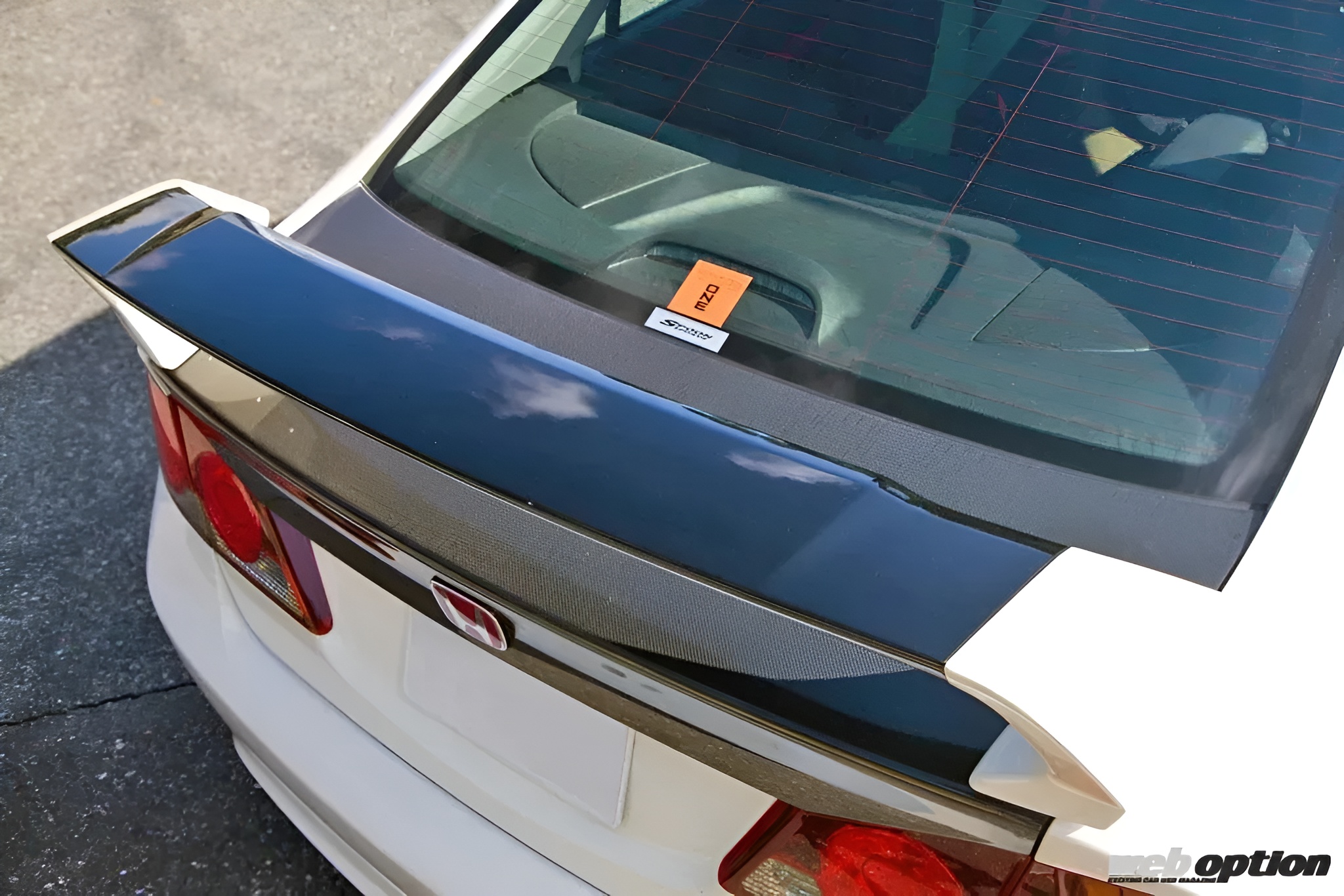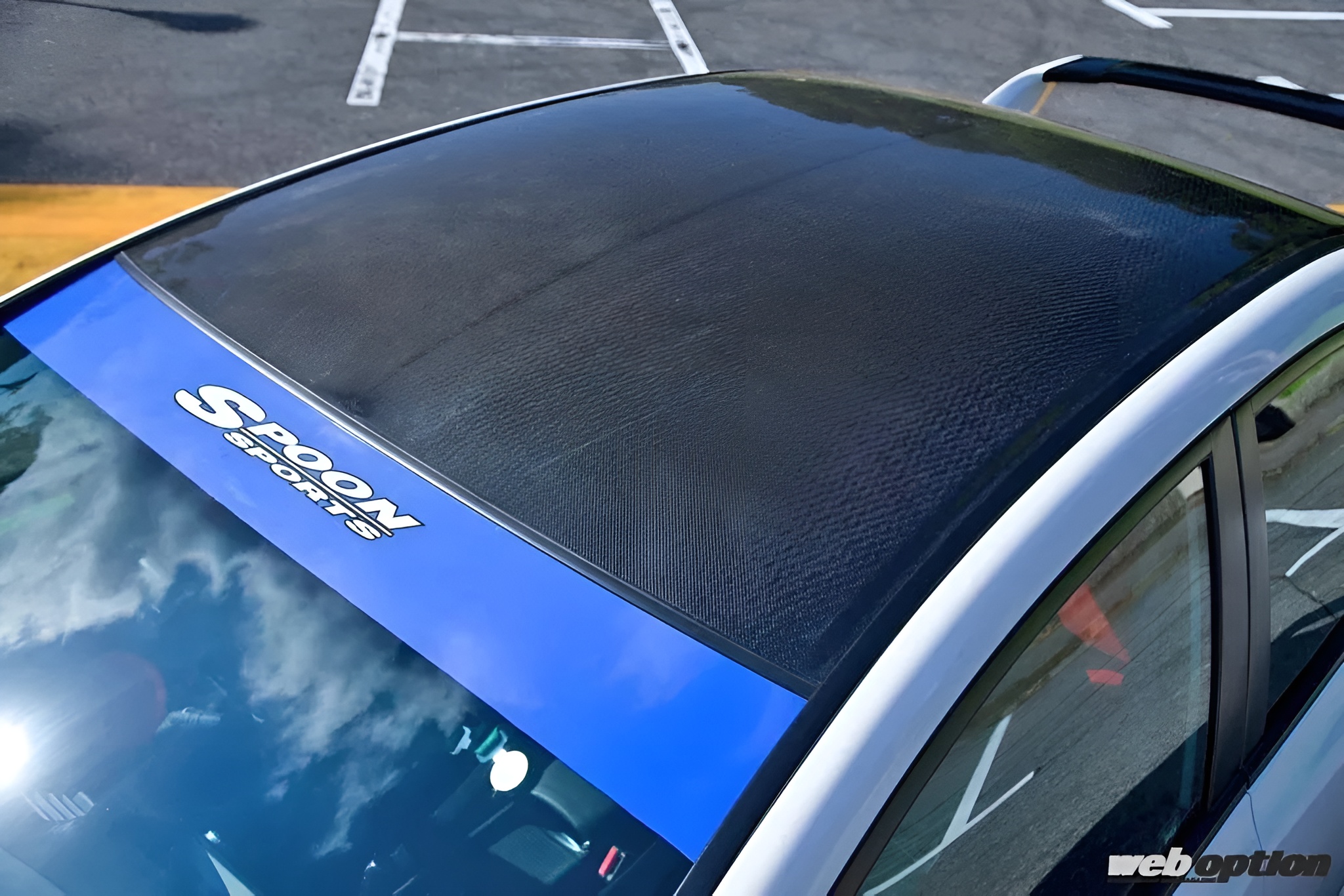 一方のエクステリアは、純正と同形状ながら単体重量でマイナス14kgを実現できるドライカーボンルーフが存在感を主張する。この製品は、童夢カーボンマジック製でスーパーGTマシンと同じ手法を採用しているというから驚かされる。また、リヤにはカーボン製のトランクリッドをインストール。こちらも純正比でマイナス約10kgを達成した高機能パーツだ。