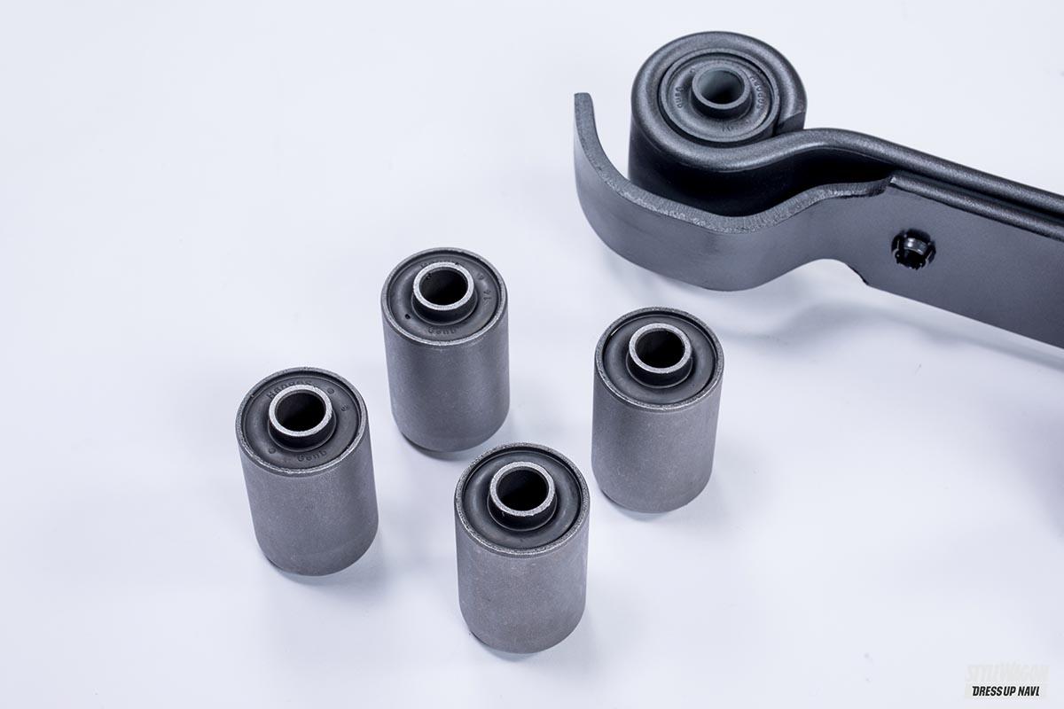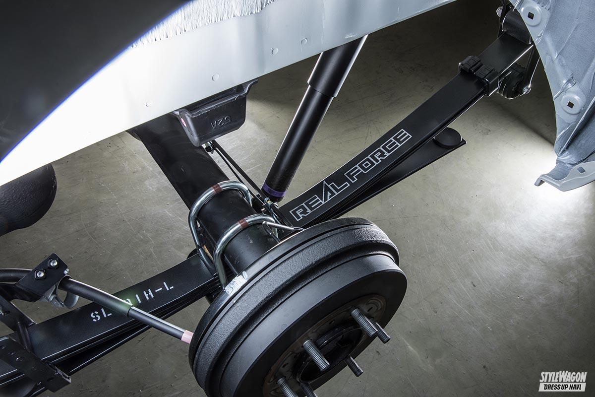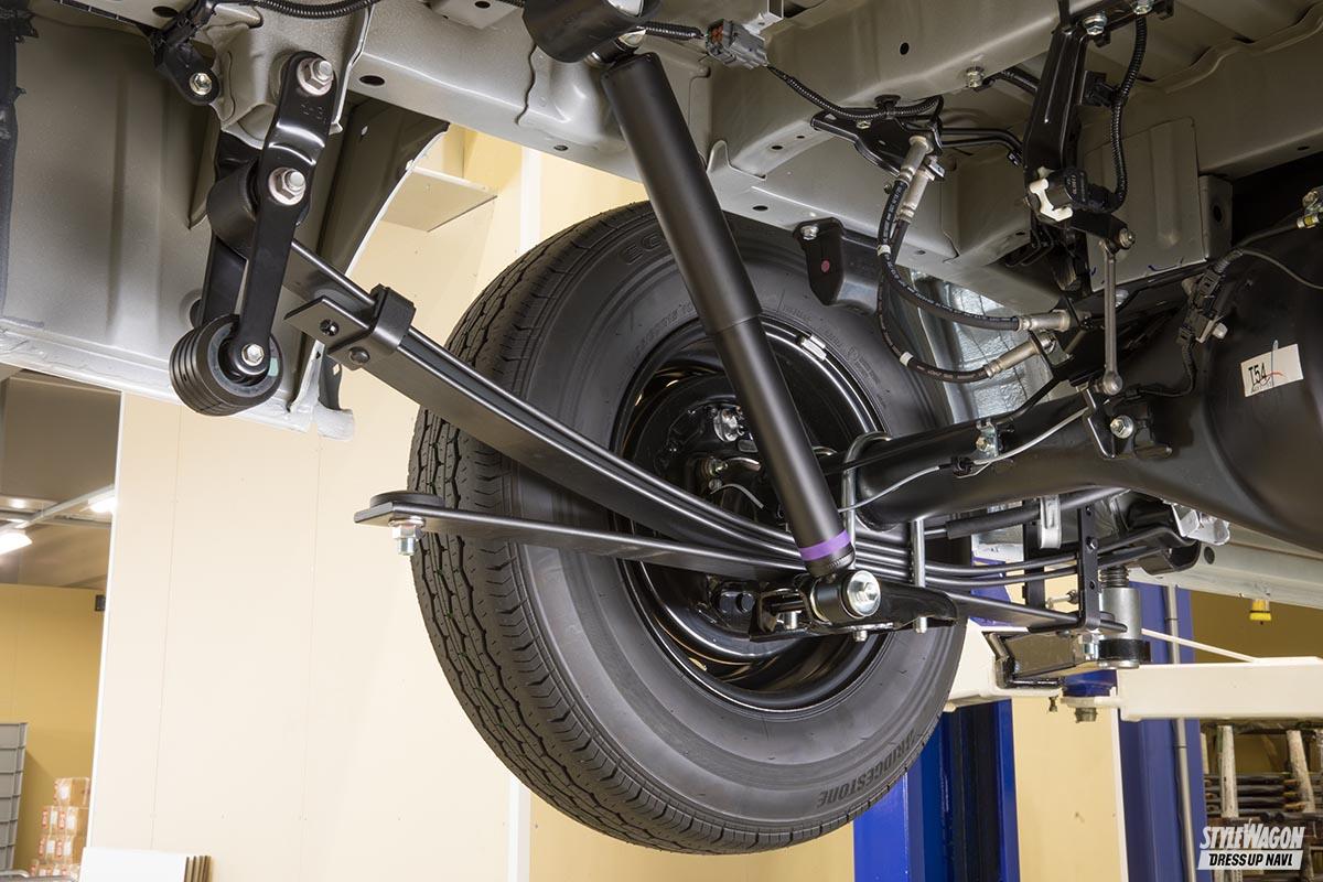 純正のリーフスプリングはラゲッジに荷物をたっぷりと積んだ状態でストロークするセッティングのため、空荷状態では突き上げ感が気になってしまう。