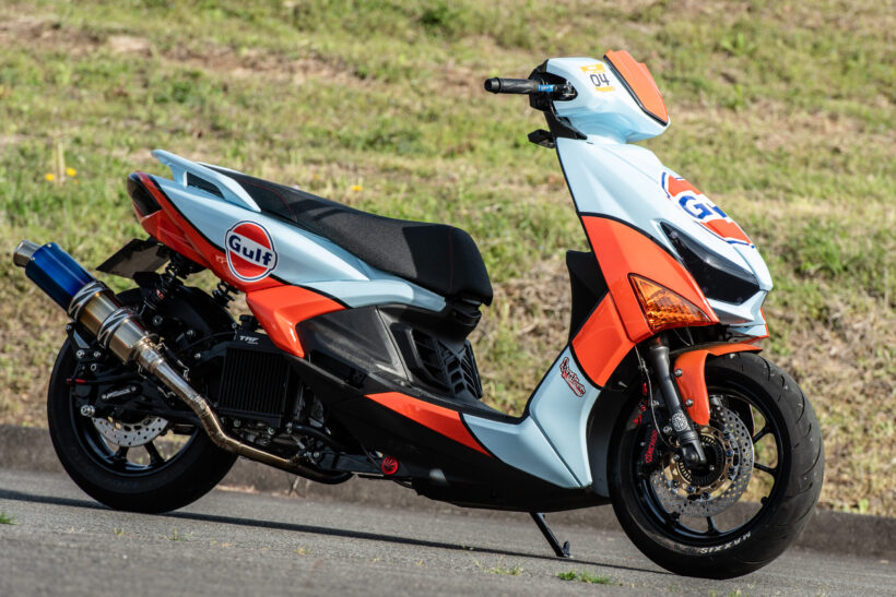 フルチューン(バイク) シグナスグリファスの日本最速を目指してTRF製304ccキットで【モトチャンプ最高速チャレンジ2026】に参戦!【写真・5枚目】 ペイントはテーラデザイン製。美しい仕上がりに注目だ。 モトGPに参戦する小椋藍選手をリスペクトしたというGulfカラー。 ライダーでもあり、ぱpーティーアップのトップでもある西澤氏は、モトチャンプの全国大会の覇者でもあるトップライダーだ。 フロントフェンダーにはパーティーアップ製のカーボン仕様を装備。 リヤのフェンダーレスはADIO製。スッキリとしたリヤビューを作り出している。 ヘッドライトとテールレンズにはスモークカバーが装着されている。 この画像の記事を読む