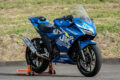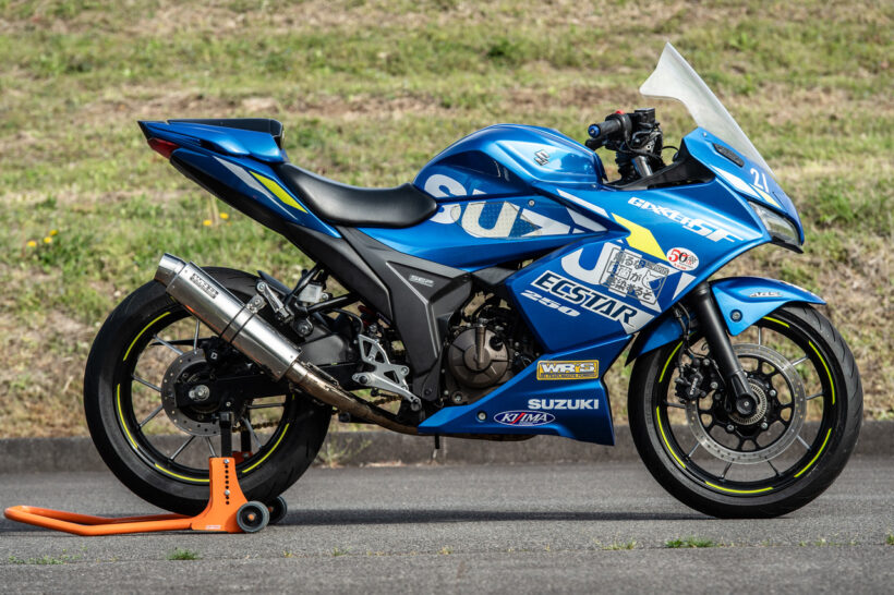 ロイヤサスペンションはジクサー150用ASSYをポン付け。イニシャルは最弱の設定としており、これによりリヤの車高は約3mmアップしているという。