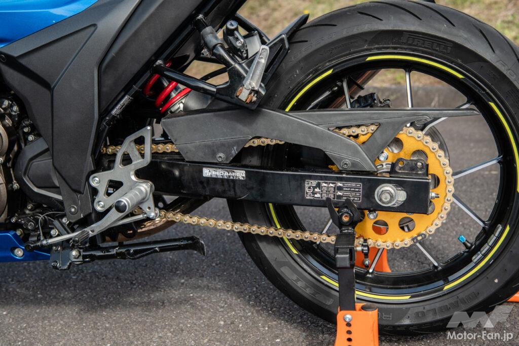 ハンドリングとバンク角の改善のため、リヤタイヤは150/60R17から、140/70R17に変更し、タイヤ外径を618mmから628mmに変更。ファイナルギヤは15-41として最高速161km/h設定としている。