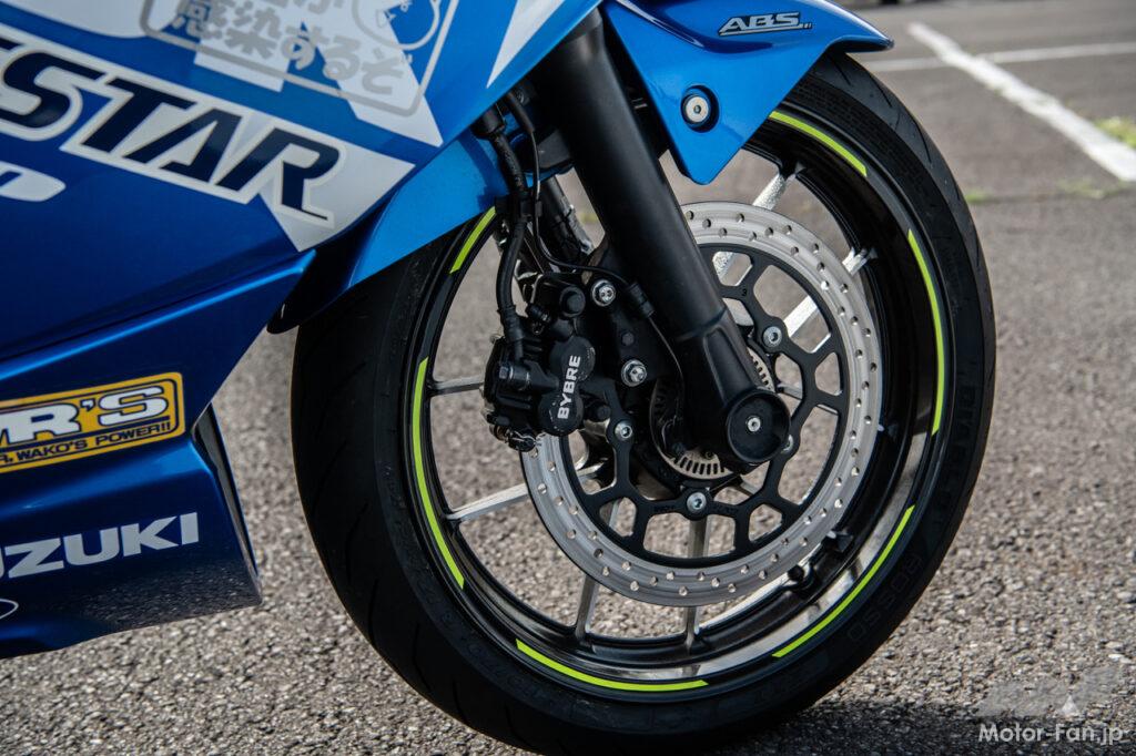 フロントフォークのスプリングにはジクサー250用を使用。SF用より全長が9mm長いがポン付けできるという。フロントのブレーキパッドはSBS製としており、