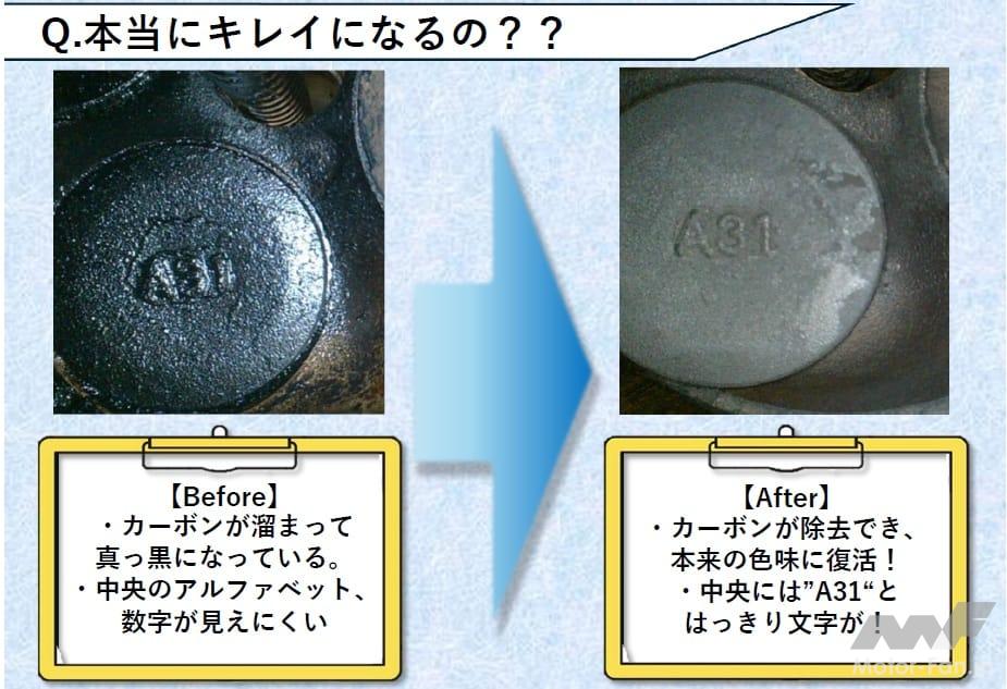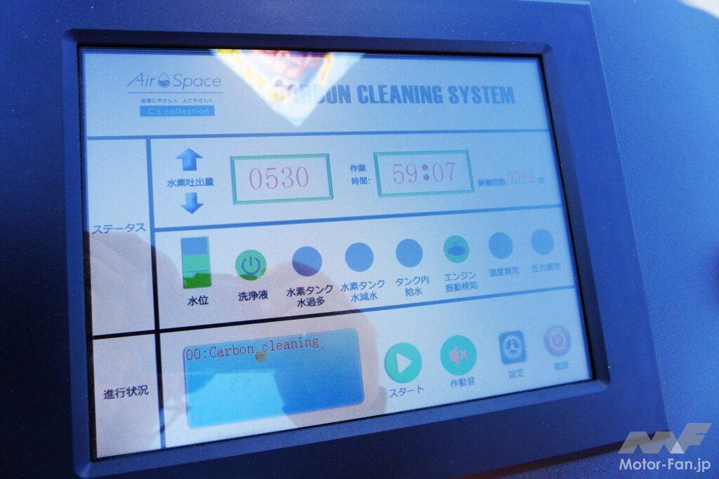「水素カーボンクリーニング」とは聞き慣れないサービスだが、どのようなものかと言うと、エアクリーナーから水素を注入し、空気中の酸素と混合させることで酸水素ガスを作り出し、それによってエンジン内部の燃焼室に付着したカーボンを焼き切るというもので、除去したカーボンはマフラーから排気ガスとともに排出される。