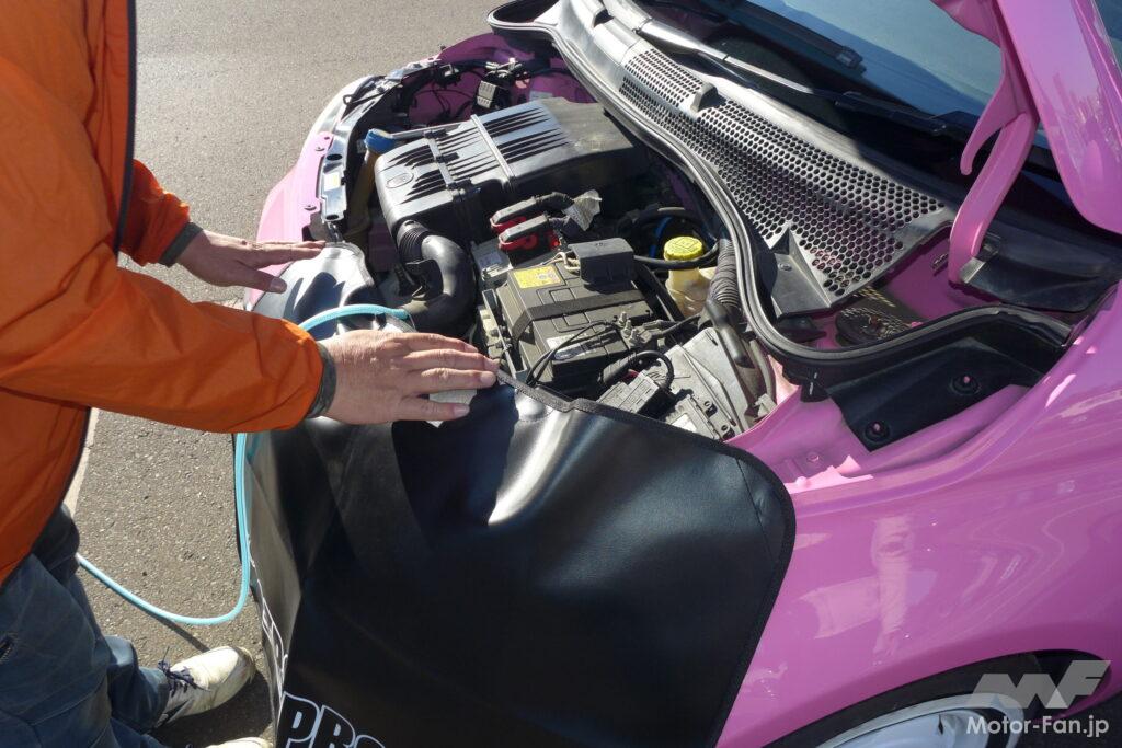 通常、店舗では60分2万円ほど(車種やコンデイョンによっても異なるようだ)で施工しているそうだが、今回はイベント限定のサービスプライスということで、50分1万円で施工するという。興味を持った筆者は、さっそく12万3500kmを走行したフィアット500PINK!で試してみることにした。