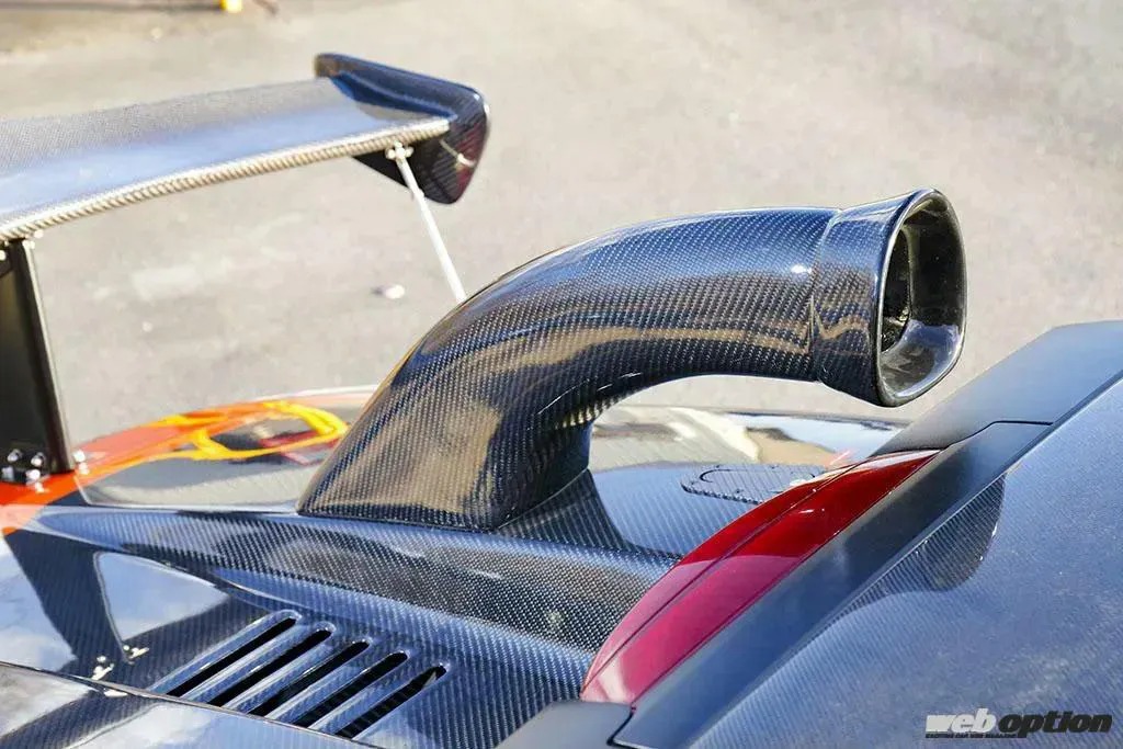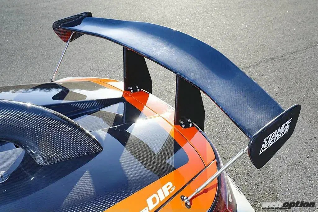 カーボン製のGTウイングは、より車体後方にマウントしてダウンフォースの増強を狙う。そのための台座や専用ステーも新たに製作した。カーボンのエンジンフードは、重量が増えがちなリヤ周りの軽量化を実現する。