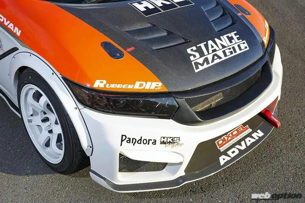 アグレッシブなフロントバンパーおよびダクト付きのカーボンボンネットもパンドラの製品だ。バンパーはグリル一体型デザインとすることで開口部面積を稼ぎ、ラジエターへの導風効果を高める。