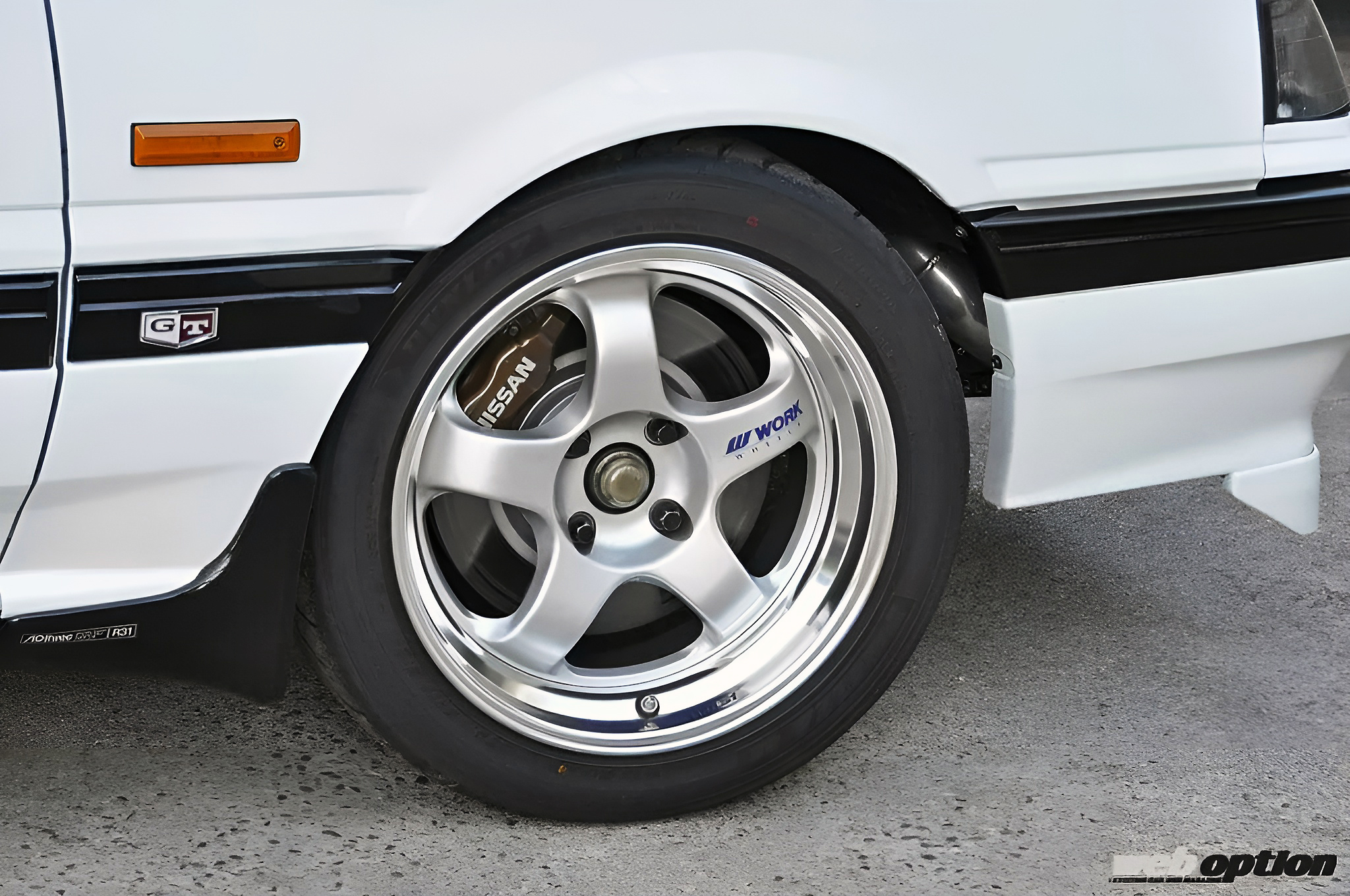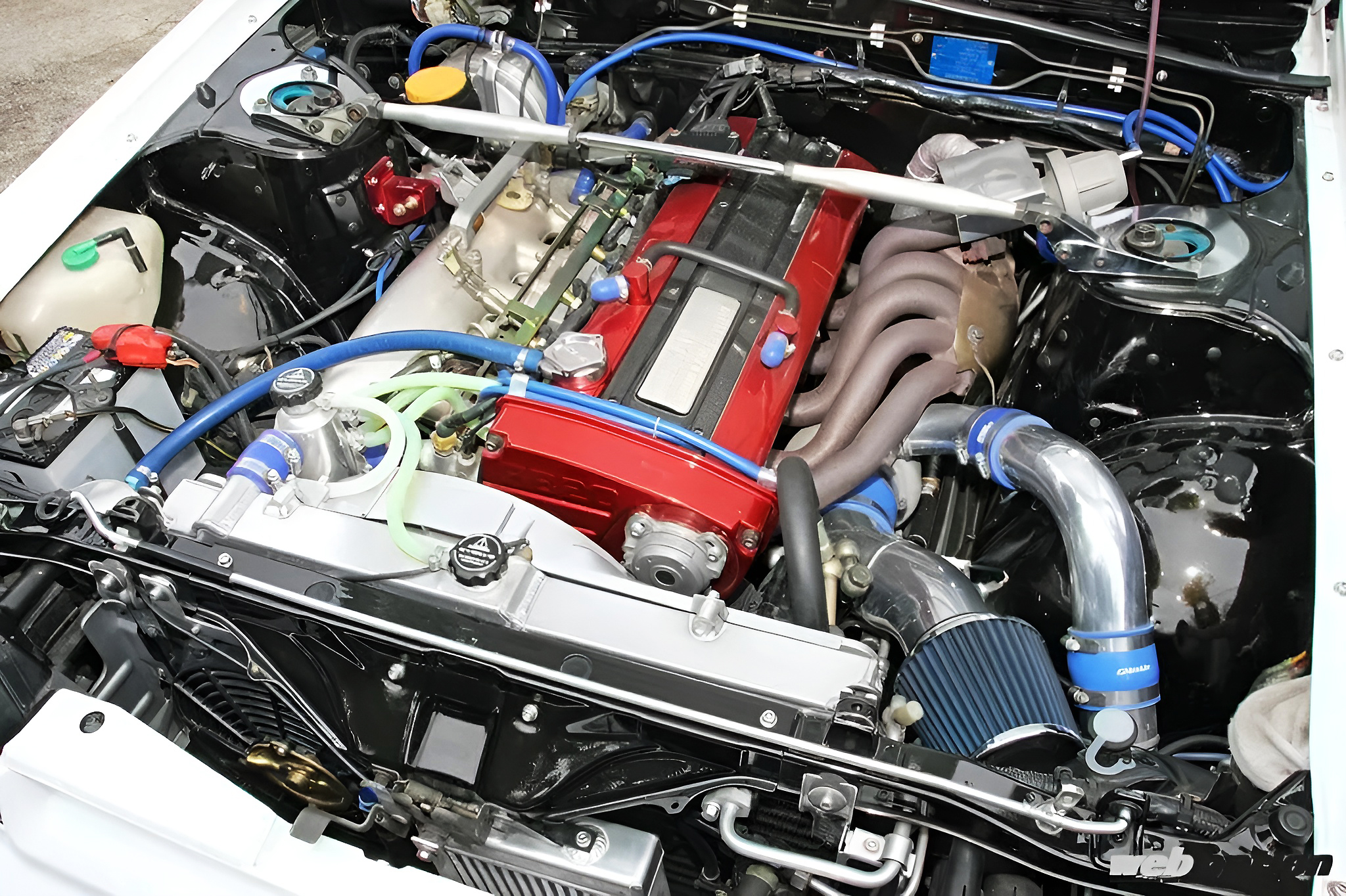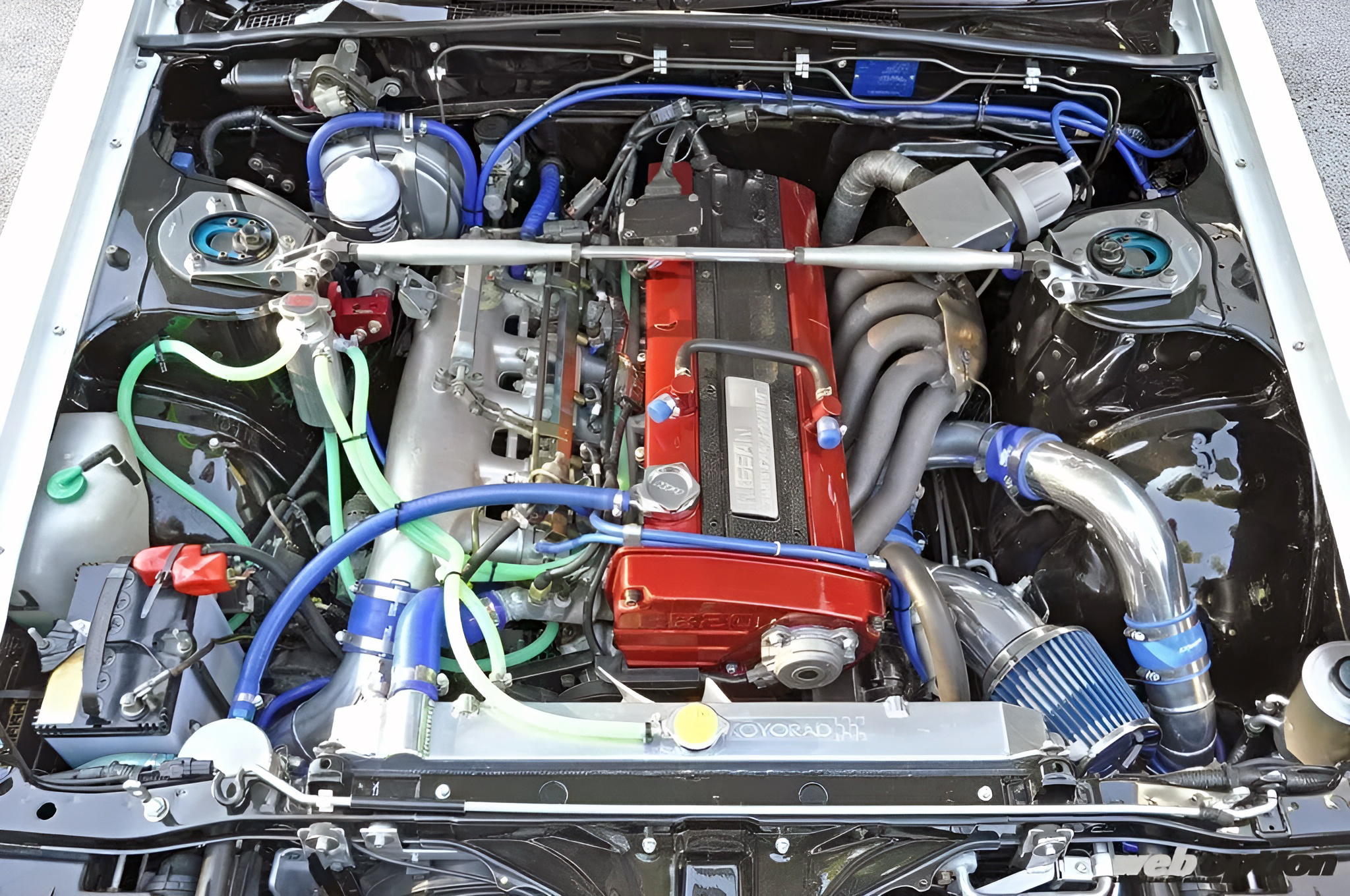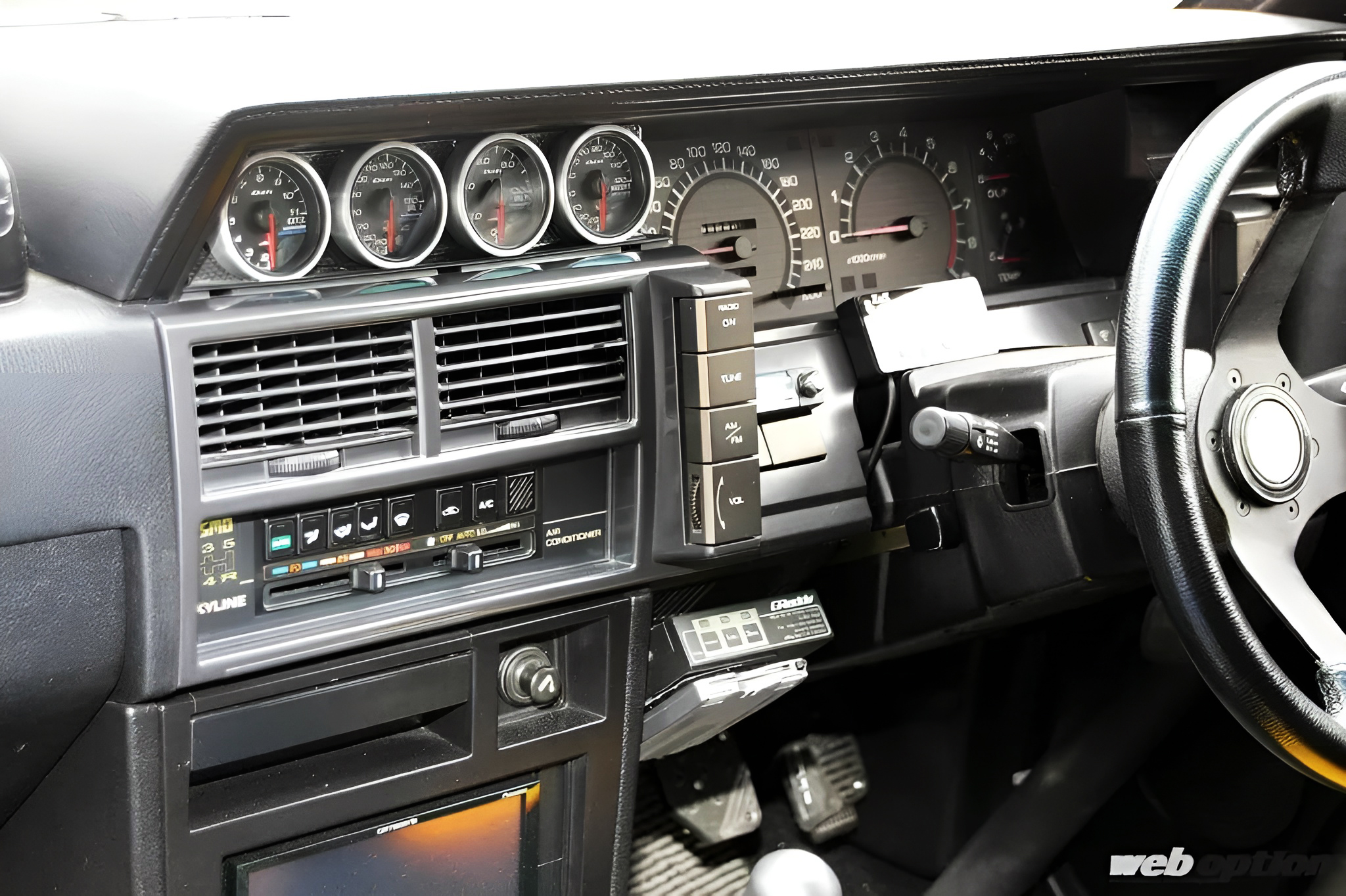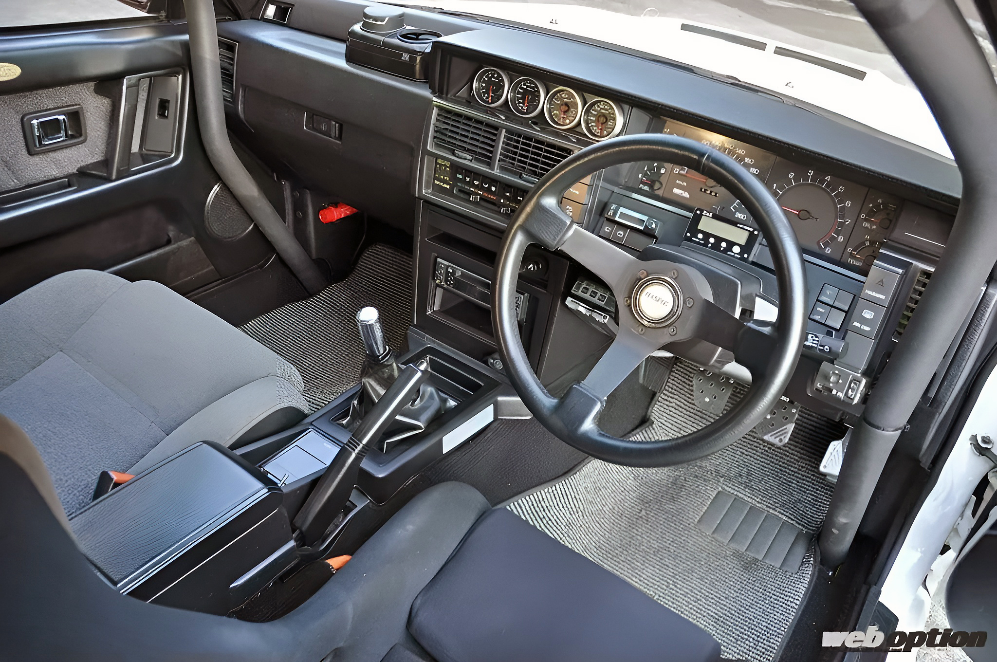 “ハイテックパフォーマンス”が手掛けたR31は、そんなRBエンジン黎明期を飾ったRB20DEが搭載されたモデルをベースに、サーキットと日常シーンの両立を目指してスペックアップされた1台。2.4L化を軸に、当時仕様らしい荒々しさを残しつつトラブルフリーの走行性能を与えているのがハイライトだ。