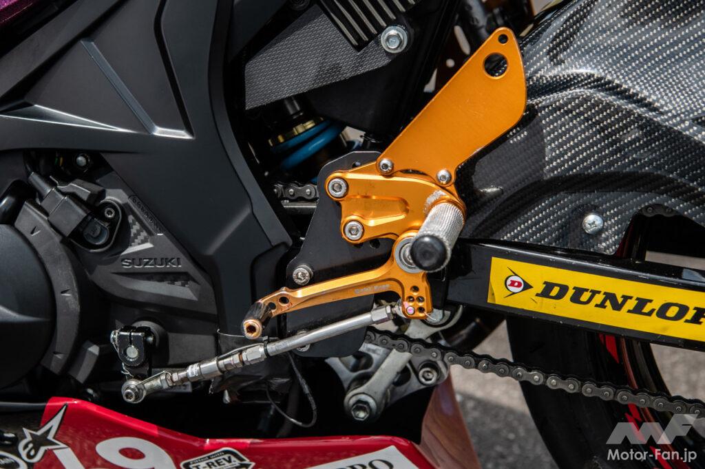 ブラックアルマイトのベースプレートにゴールドアルマイトのアルミ削り出しパーツによる鮮やかなバックステップには、シフトアップ時のロスを削減するクイックシフターを装備。