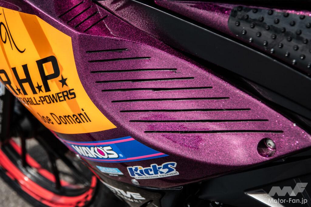 サイタニヤ製カウルの中央部にはエアーの導入口が設けられており、ダクトを設置してフレッシュエアーをスロットルボディ付近まで運んでいる。カウルサイドのウイングはエクステリアのドレスアップとなる。