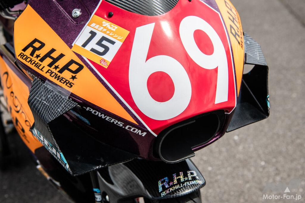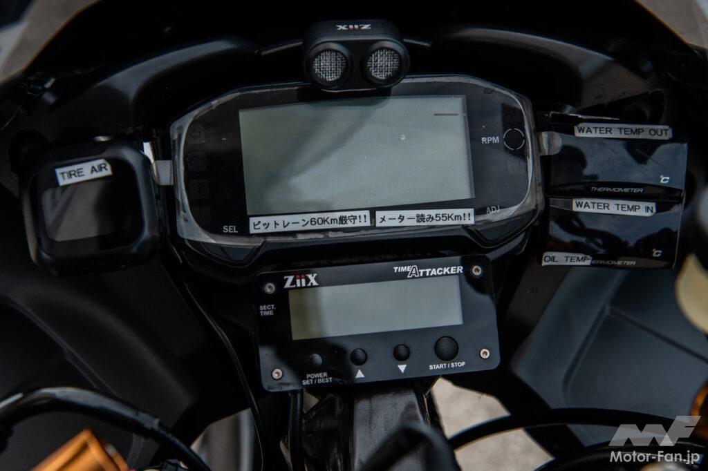 KOSO製デジタルメーターとZUX製モニターを搭載。「ピットレーン60km/h厳守!!」というメモは、サーキットのピットレーンには制限速度があり、これに違反するとペナルティが与えられるため、注意喚起として記されている。