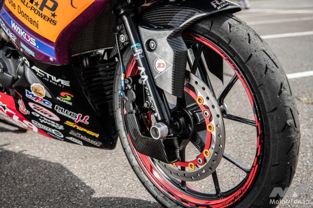 フロントフォークはノーマルを使用し、内部をGEARS製フロントインナーキットに変更している。また、ホイールやキャリパーはノーマルとしながら、ディスクローターはプラスミュー製に変更。キャリパーに外気を当てて冷却するためのダクトも追加されている。